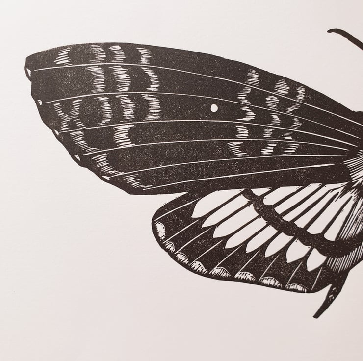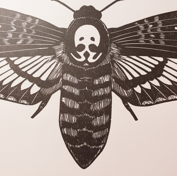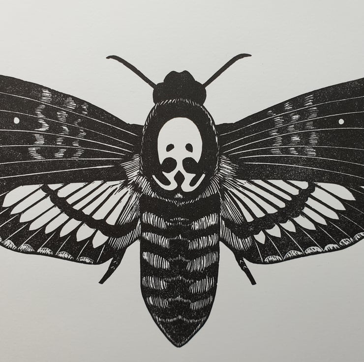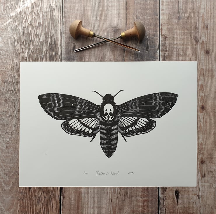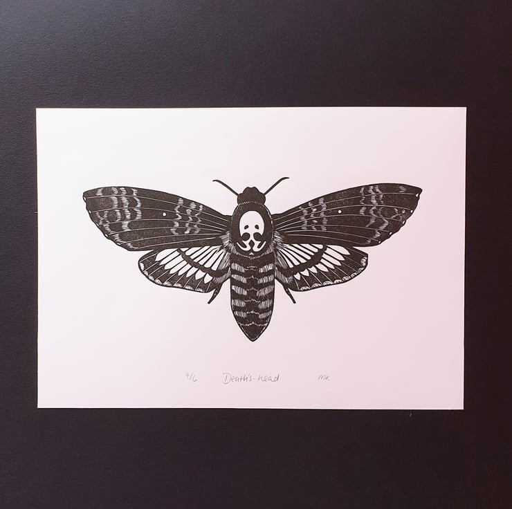 A4 size original linocut illustration of the Death's Head hawk moth.