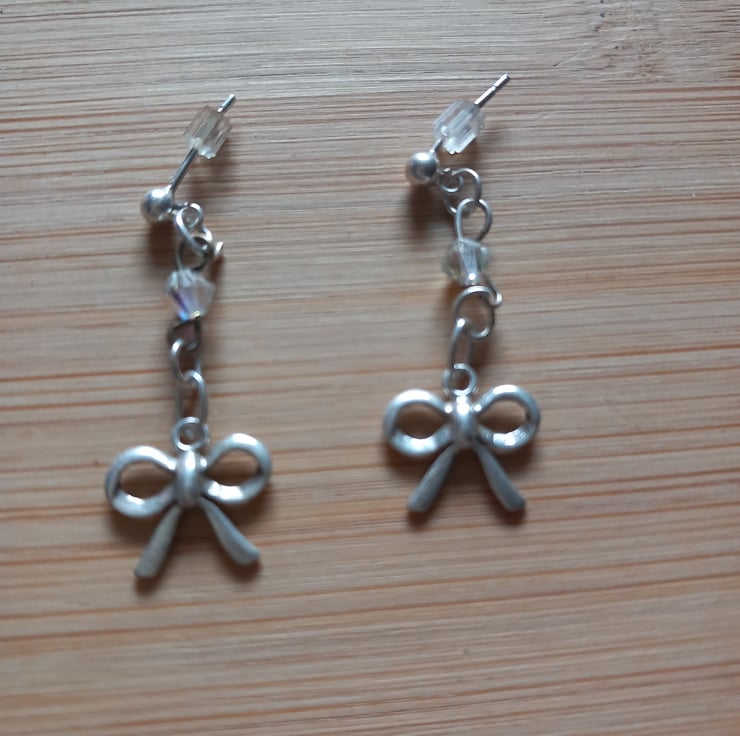 This is a pretty pair of delicate earrings set on sterling silver earwires. The earrings are comprised of clear Austrian crystals which have an iridescent quality which makes the earrings sparle as they catch the light. A sterling silver bow charm completes the design making these earrings perfect as a gift for many occasions such as birthday gift for a friend, a bridesmaid gift, wedding day jewellery, communion or baptism or even as a gift to yourself..