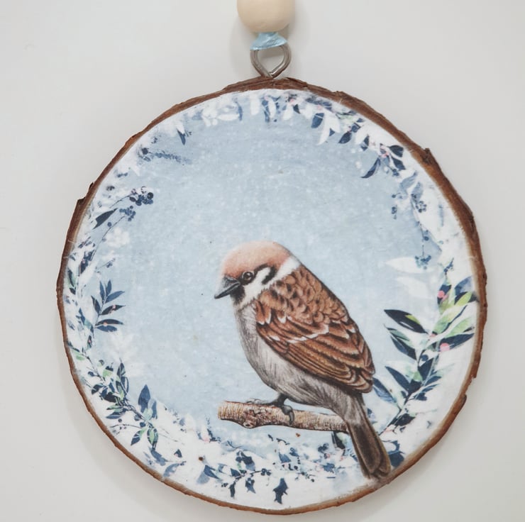 Sparrow in winter hanging wood slice decoration. The wooden slice has been painted white and lovingly decoupaged with the pretty sparrow design and then sealed for protection. The reverse of the slice has not been decorated. A metal loop has been screwed into the top and has a wooden bead and pastel blue satin ribbon ready to hang. This lovely sparrow decoration would make a great gift for a bird lover and could be hung in a window, from a door handle, knob or shelf, etc.