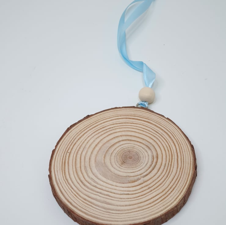Size of wood slice without metal loop and ribbon: 12.5 cm x 12 cm x 1 cm depth approx