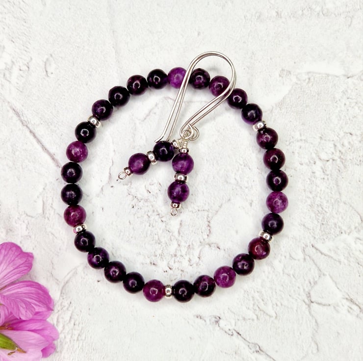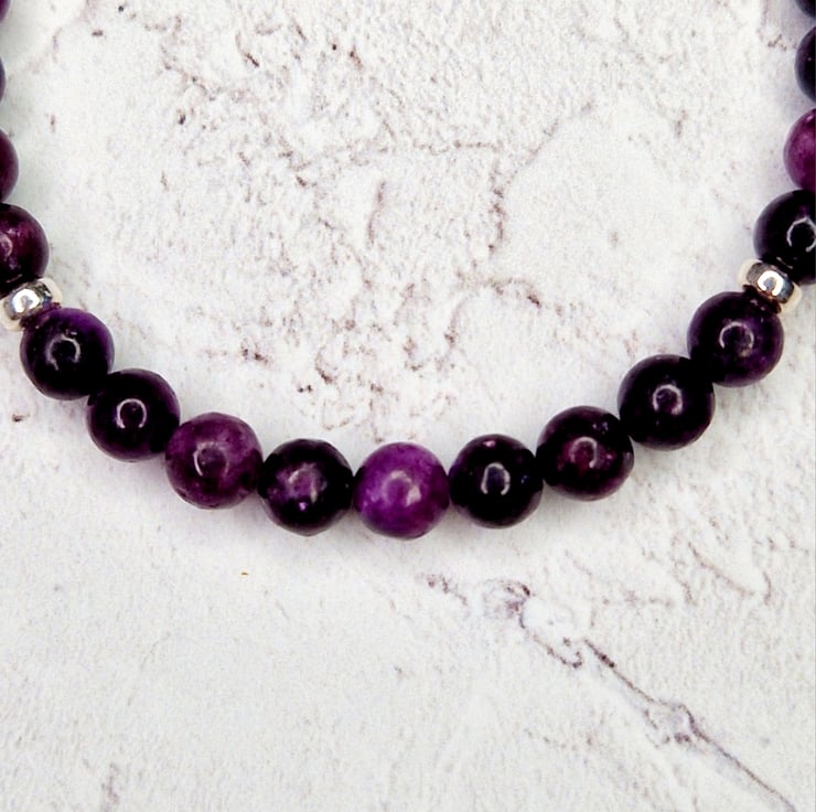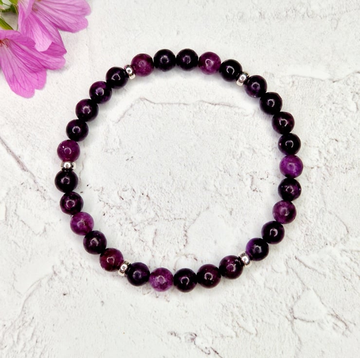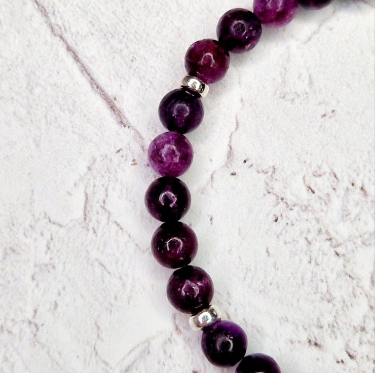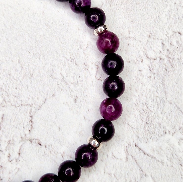 The bracelet is 18 cm made of 6 mm lepidolite beads that range in colour from deepest purple to shades of lavender and lilac with occasional darker swirls and patches. Each of the beads differs from the next and all have a soft sheen polish.