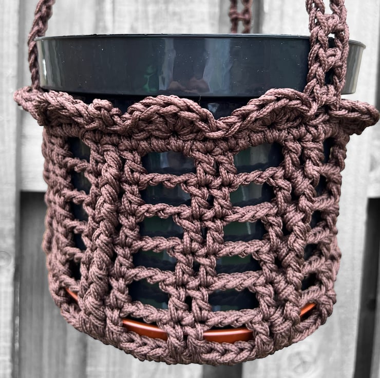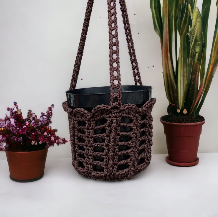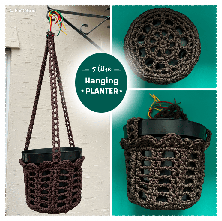 This crocheted Plant hanger has been made from nylon paracord. Nylon is one of the strongest rope fibres available and, when woven into a tight lock-stitch braid, it creates a level of strength and sturdiness that is difficult to match, plus it is built to withstand the elements so this plant hanger can be hung outdoors or indoors. The pot is a plastic pot and is 5Ltr in size. It also has a saucer that the bottom to catch any water that may reach the bottom so you know it will be safe to hang in your home. Crocheted by me in my hometown of Llandrindod Wells.