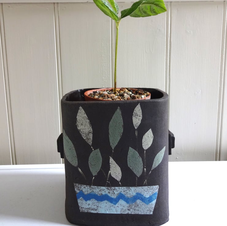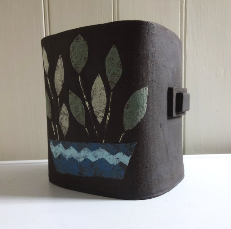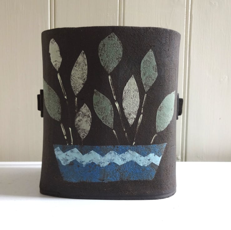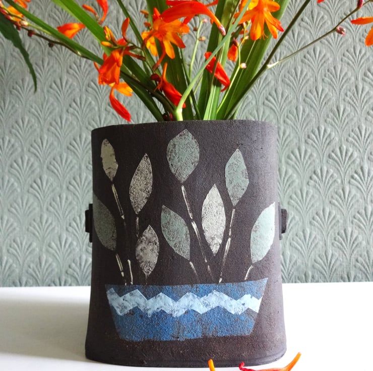 Original handmade ceramics say so much about you, your home and your lifestyle. This black ceramic vessel works well as a container for your favourite small potted plant, (cacti and succulents could look great!) or as a vase for flowers or grasses. I make the form from soft clay, and then decorate each side by painting a lively motif of a leafy plant in a zigzagged blue pot. When the whole piece is dry, it’s fired in my kiln. I leave the outside of the vase unglazed to give a naturally matt surface, but finish the inside with tenmoku glaze so that it can hold water. The whole piece has a final firing to 1185 degrees C , so that the design fuses into the clay and the glaze vitrifies into a satin surface inside. The vessel will give a fresh modern look to your interiors whether you use it for flowers, grasses, to show off a potted plant, or just as an art piece by itself. Approx. 12.5x11x11 cm in a rounded squarish shape, with two little handles either side to set it off.