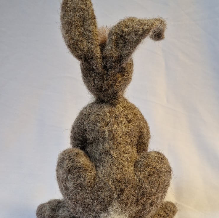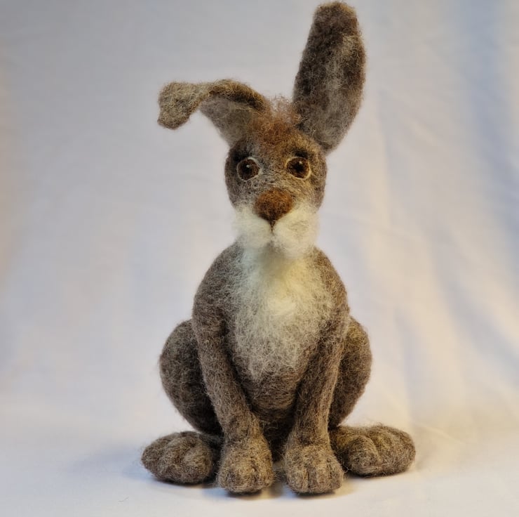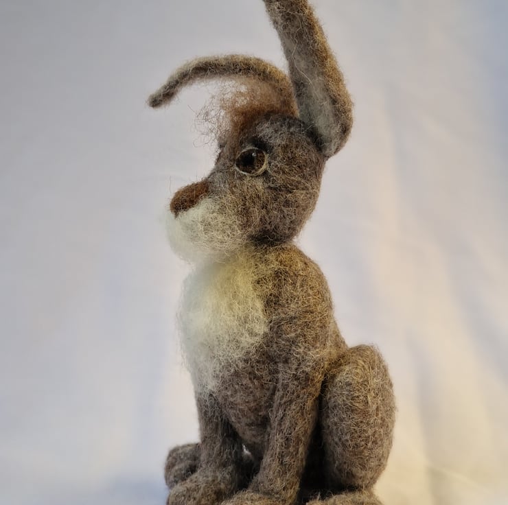 A cute whiskery sculpture of a hare needlefelted from wool on a wire armature frame, around 16cm in height plus ears.