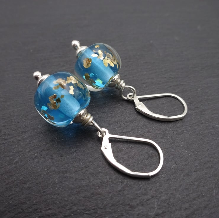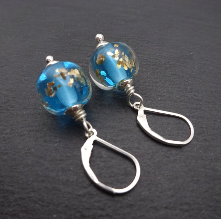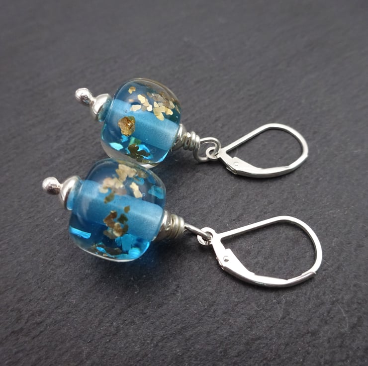 A pair of earrings made using sterling silver ear wires, sterling silver beads and handmade lampwork glass beads.