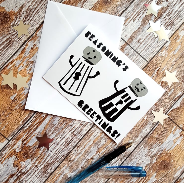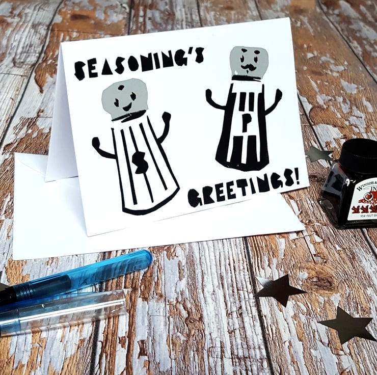 'Seasoning's Greetings!' Hand screen printed Christmas card.
