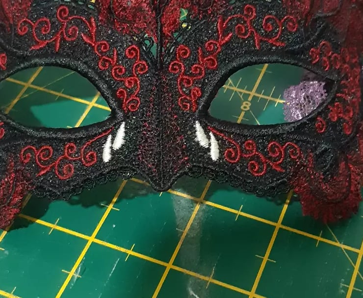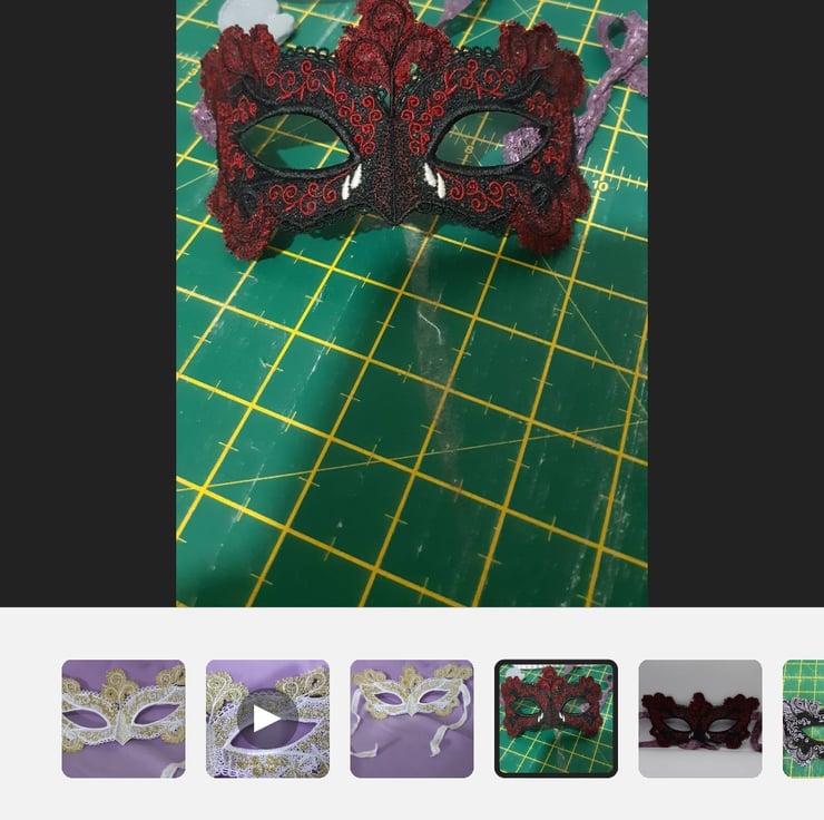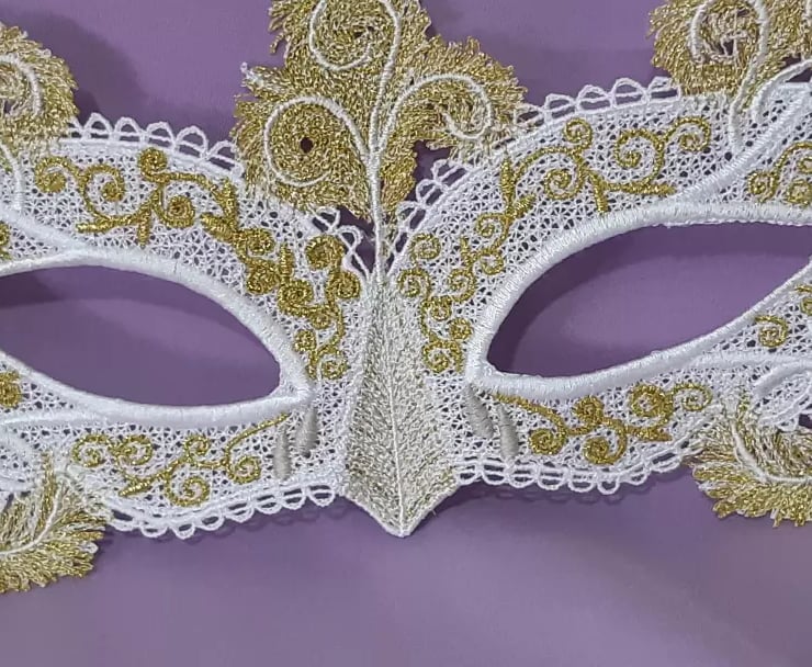 Beautiful free standing lace masquerade mask perfect for any ball or party made from embroidery thread with ribbon ties and gold metallic thread.