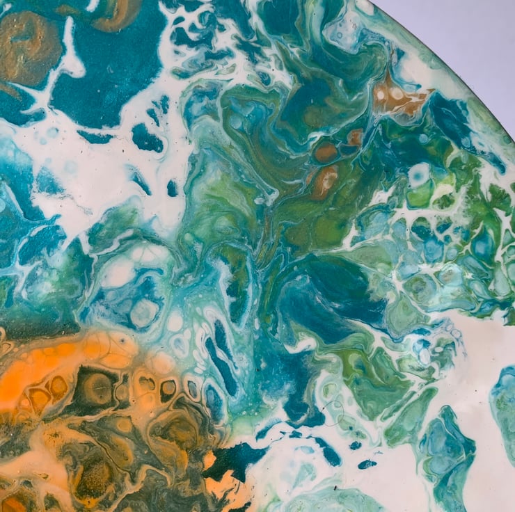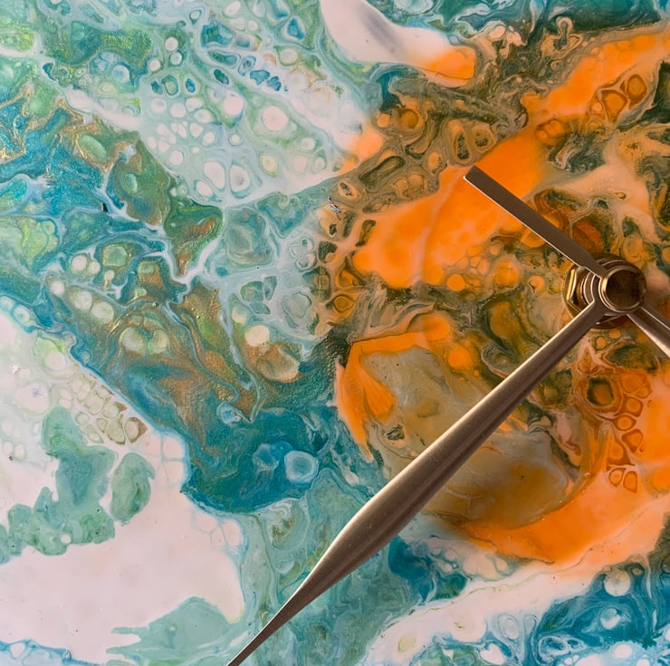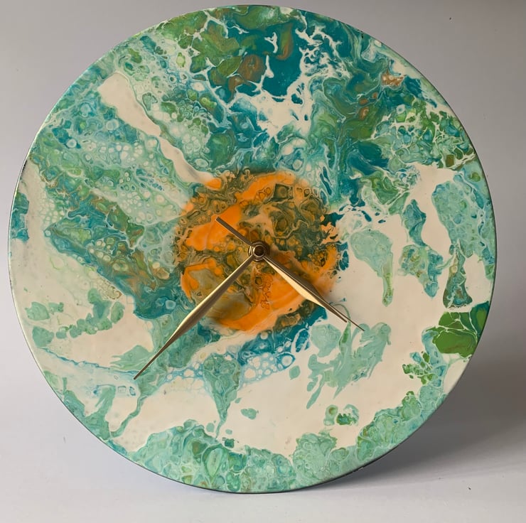 This clock has iridescent colours but is quite muted. It’s orange circle was a lucky accident.. it wasn’t there when I poured but turned up the next morning.. like the sun!