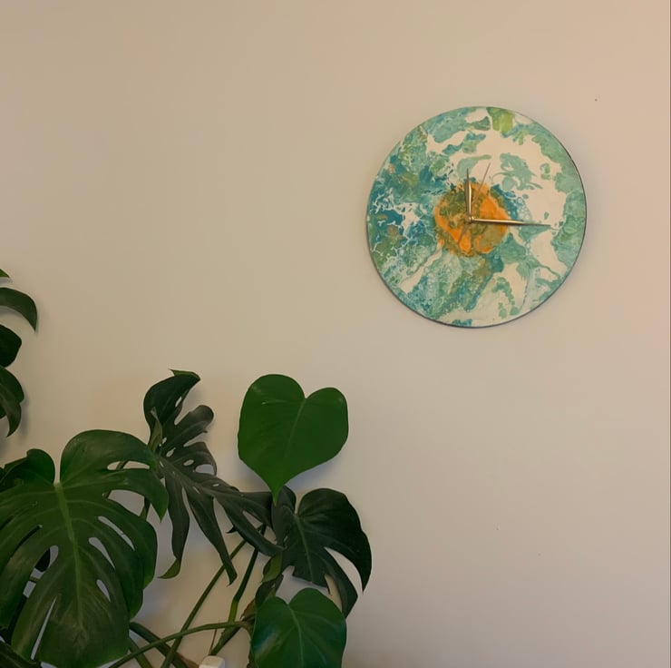 This is a 30cm diameter wall clock, upcycled from a vinyl LP record. It has been painted using an acrylic pour method, and varnished to a gloss finish. The backing is felt to create a clean look. It is fitted with a quartz battery mechanism (ticking) and has gold coloured hands.