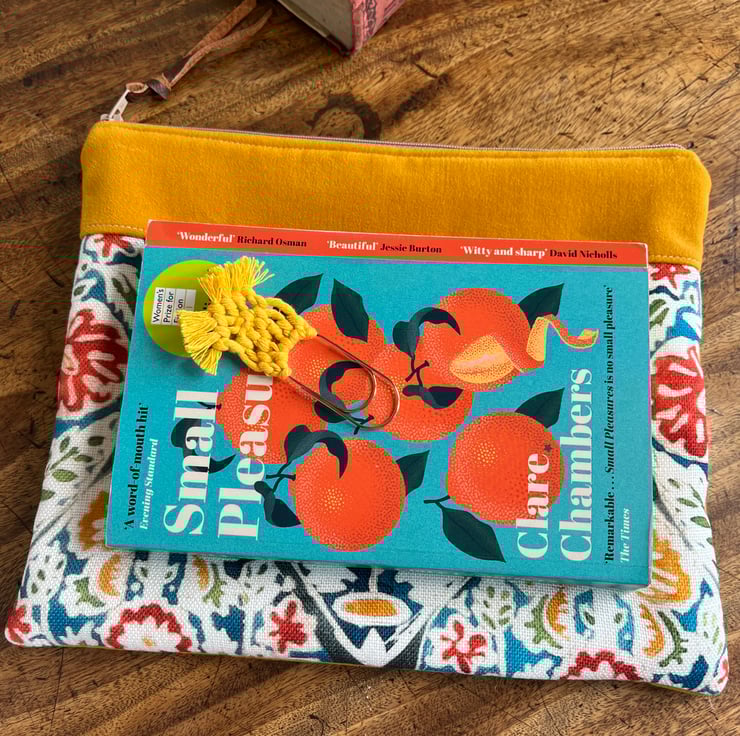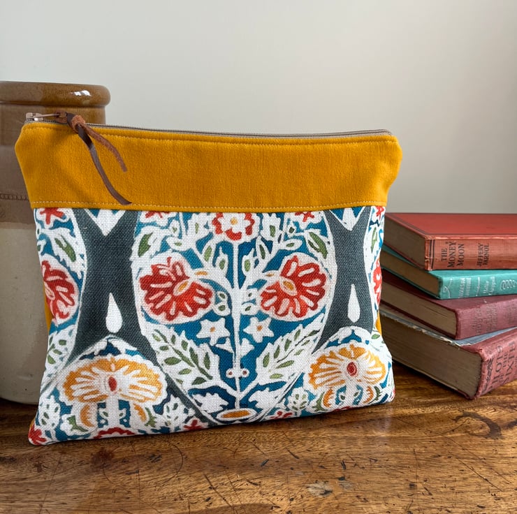 One of a kind zip pouch in pretty William Yeoward Machu linen. The pouch is a great size for a paperback book, purse and phone. It could also be used for small craft projects or cosmetics.