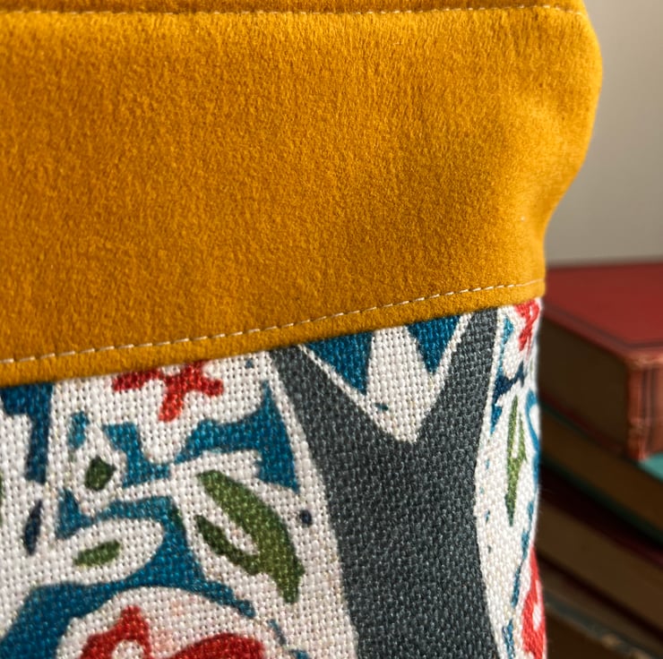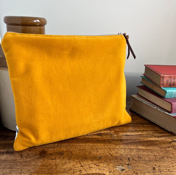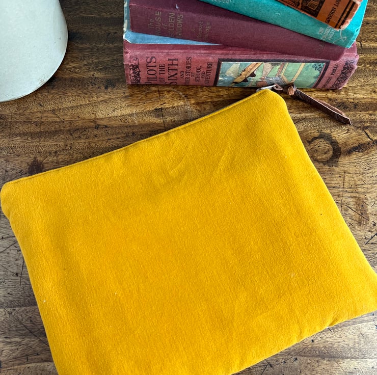 The linen is combined with soft mustard moleskin fabric from a discarded sample swatch leftover from the fashion industry. The pouch is lined with reclaimed cotton from a tablecloth.