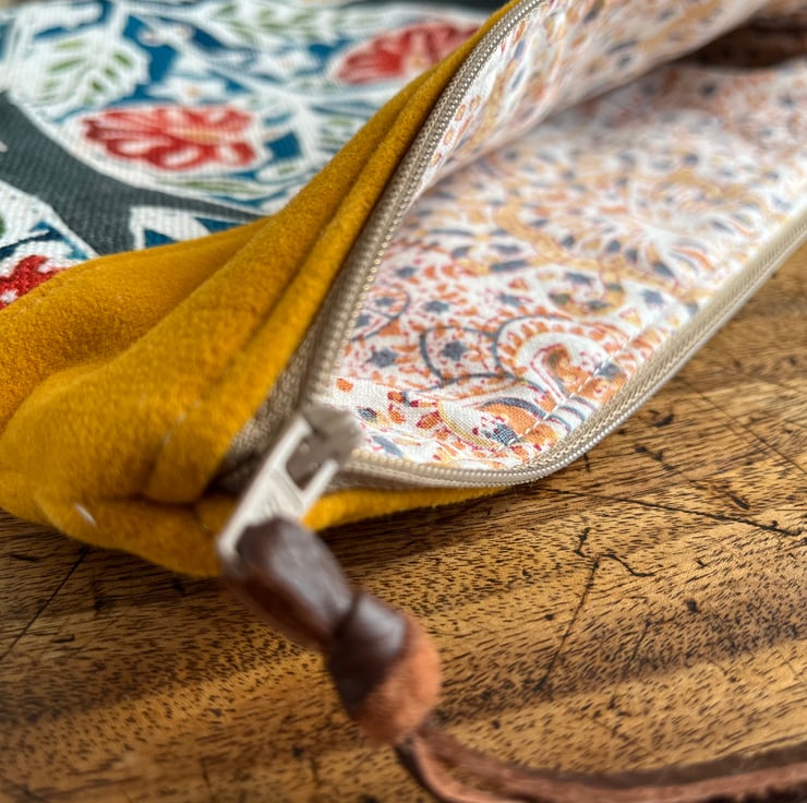 The bag has a layer of reclaimed interlining to give it a softly padded feel. The leather zip pull is a strip of leftover leather from a local upholsterer.