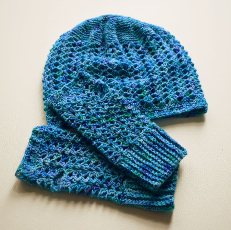 I have crocheted this set in some yarn that I hand dyed with professional acid dyes in shades of blue with the odd pop of purple. The yarn is 75% wool, 25% polyamide and is a sock weight yarn so the hat and gloves are both lightweight but are hardwearing for everyday use and ready to give you many winters of warmth.