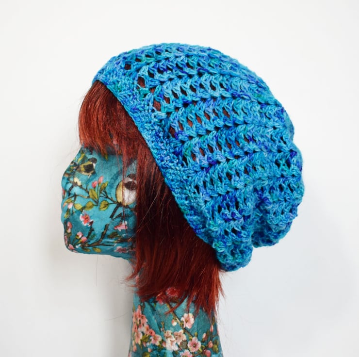 The beanie hat is slightly slouchy and measures approx 19 inches around the bottom but will easily stretch out to around 22" if needed. It is 9 inches high and the crown is made in a close knit tetxure with the body of the hat made in a lacier stitch and then a ribbed band at the bottom.