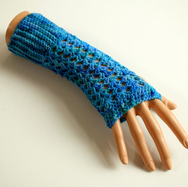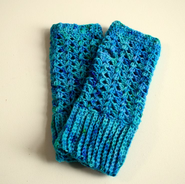 The fingerless gloves have a thumb hole at the side, ribbed cuffs to keep out the chill and the same lacy pattern over the body of the glove with a thin ribbed section at the top for a nice cosy fit.