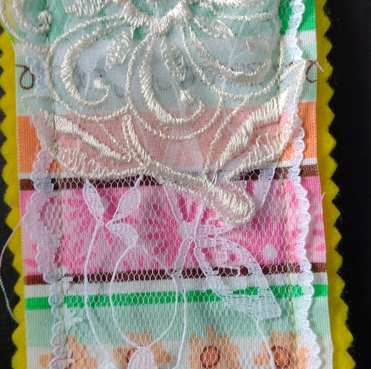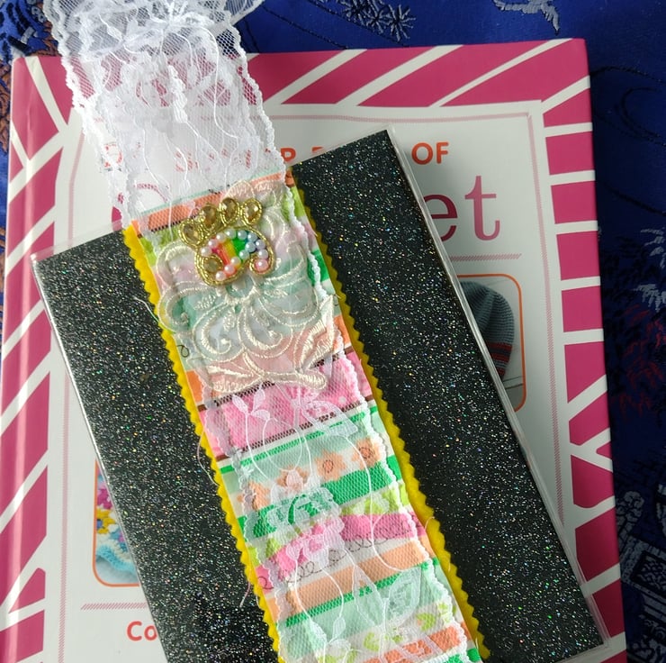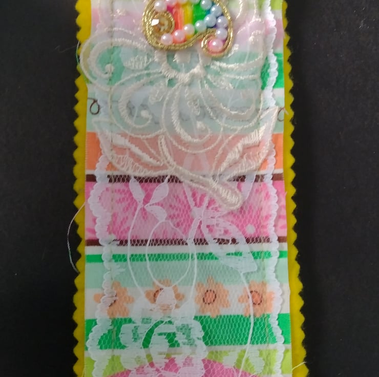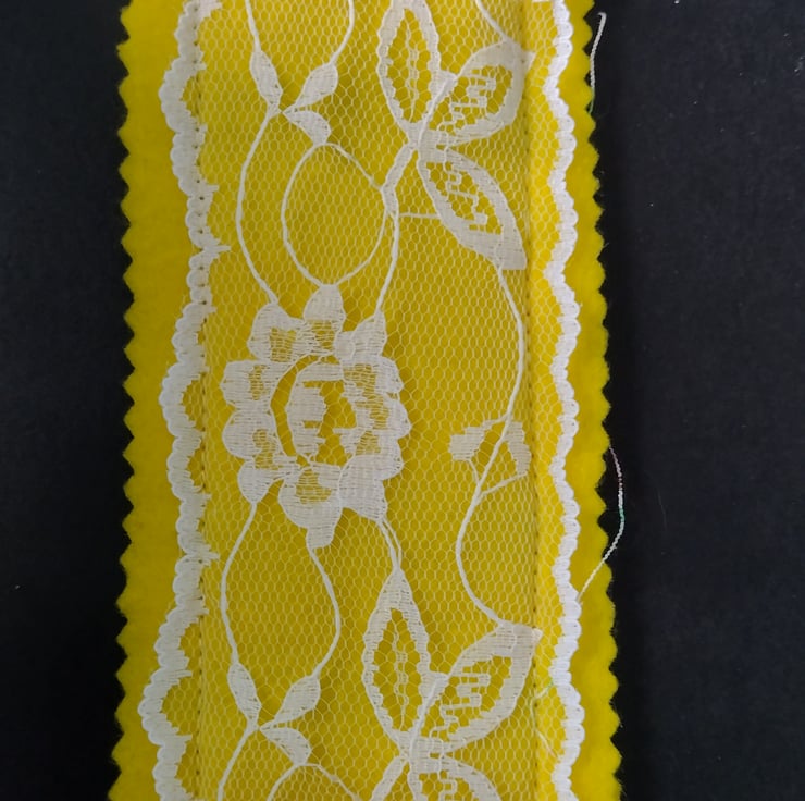 The backing is bright yellow acrylic felt which has been overlaid with lace to give a bit of structure to the bookmark.