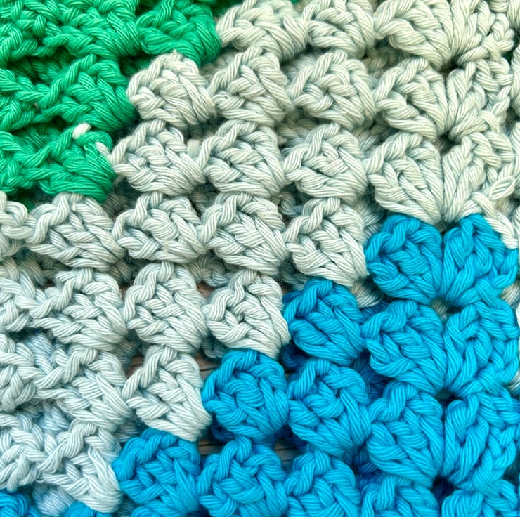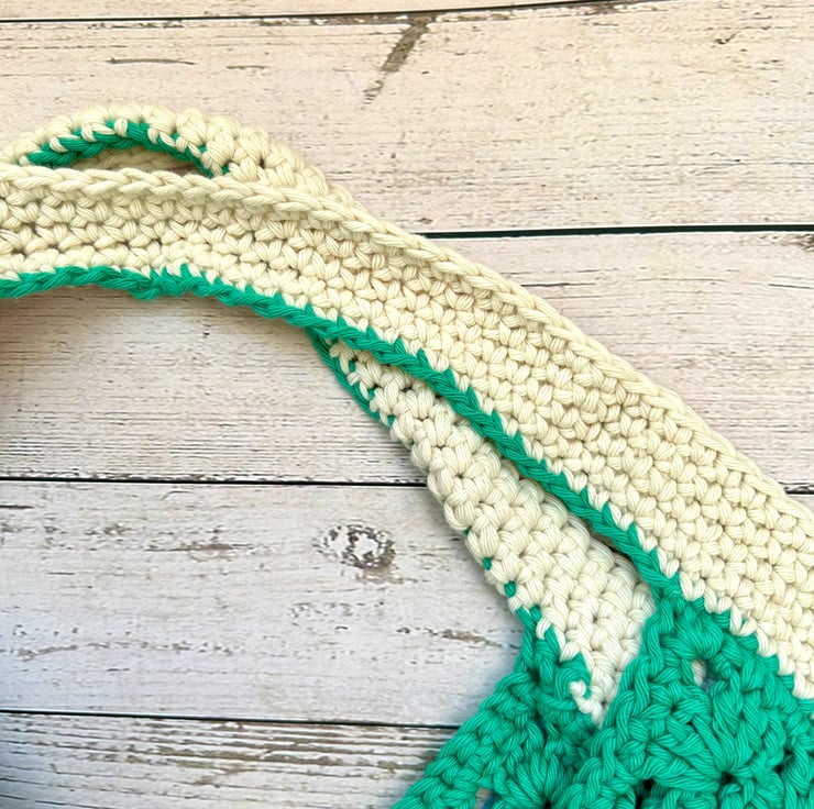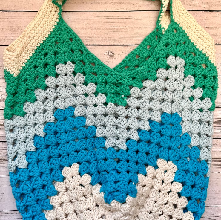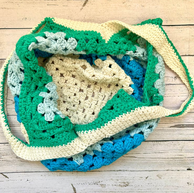 Handmade crochet market bag. Perfect for groceries. Made in blues, green and cream.