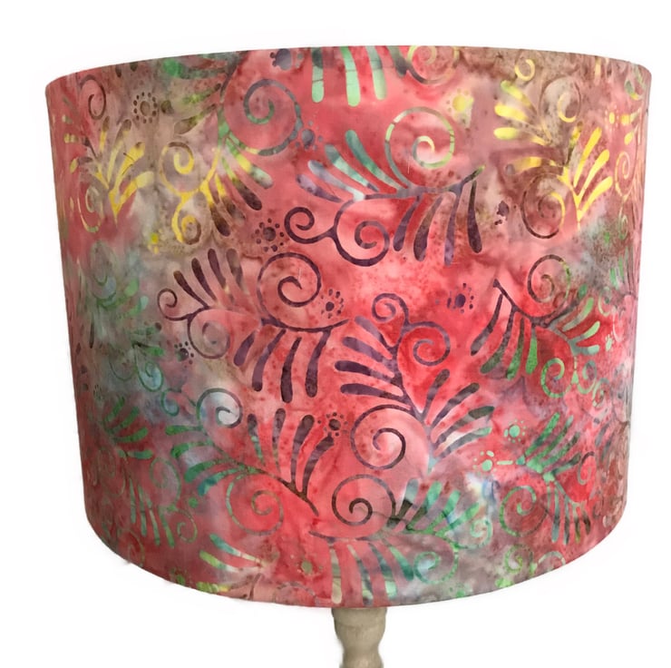 This unique drum lampshade has a summer vibe, with blush red, even pink tones covered with green, yellow and purple stylised leaf design.