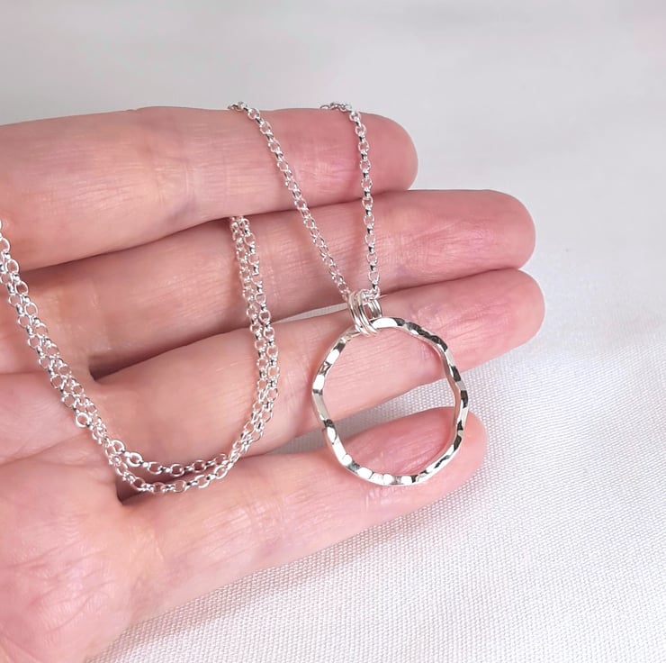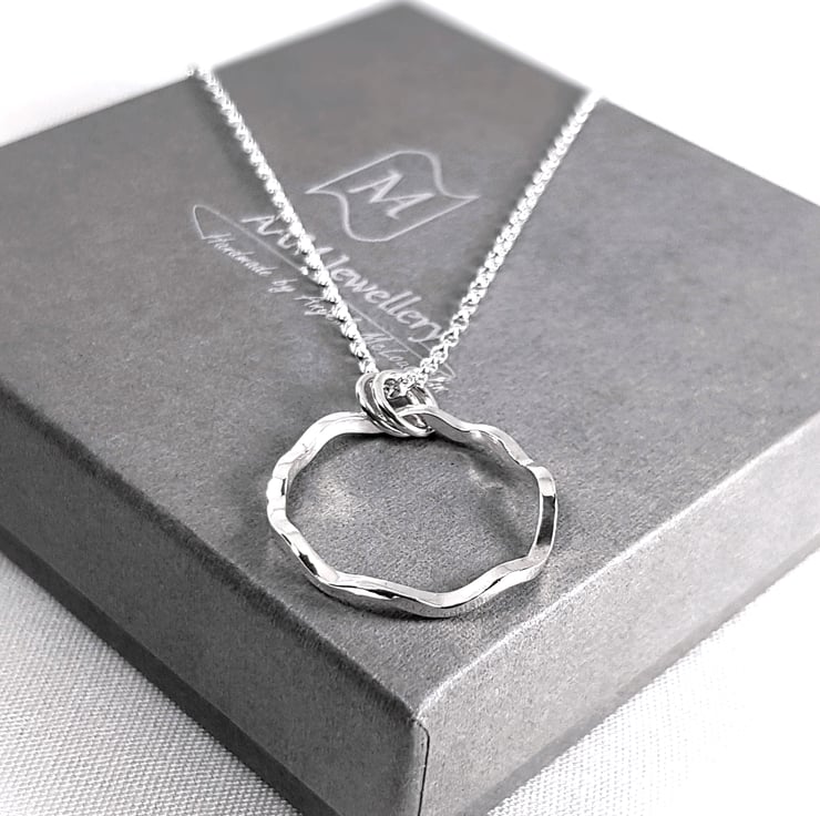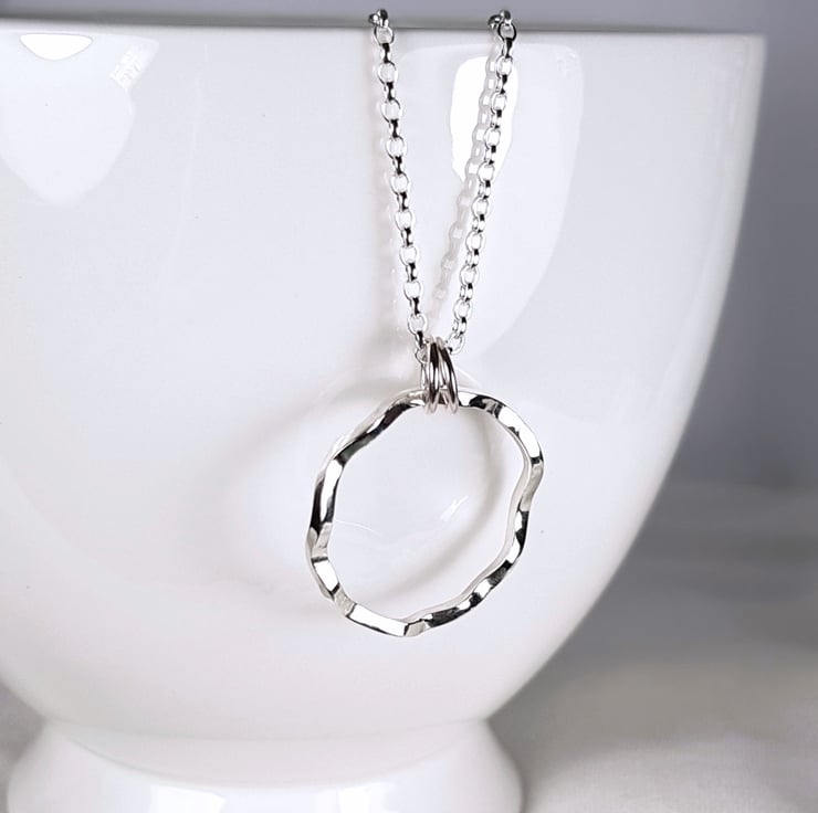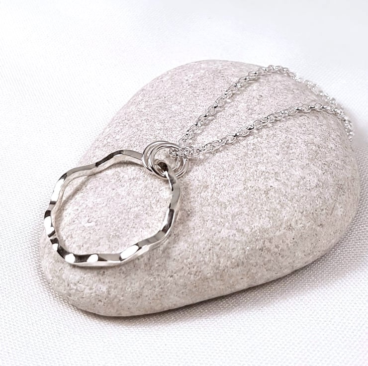 Sterling silver circle necklace featuring an organic wavy design and finished to a high polish. The pendant is handmade using 1.5mm recycled sterling silver wire and hangs from a detachable 45cm (18 inch) sterling silver chain.