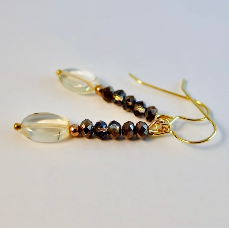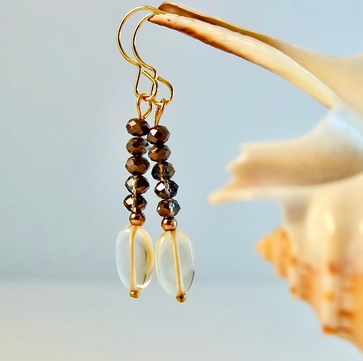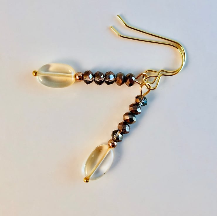The mink coloured, faceted glass beads have an electroplated coating that gives them extra sparkle and flashes of purple and gold when they catch the light.