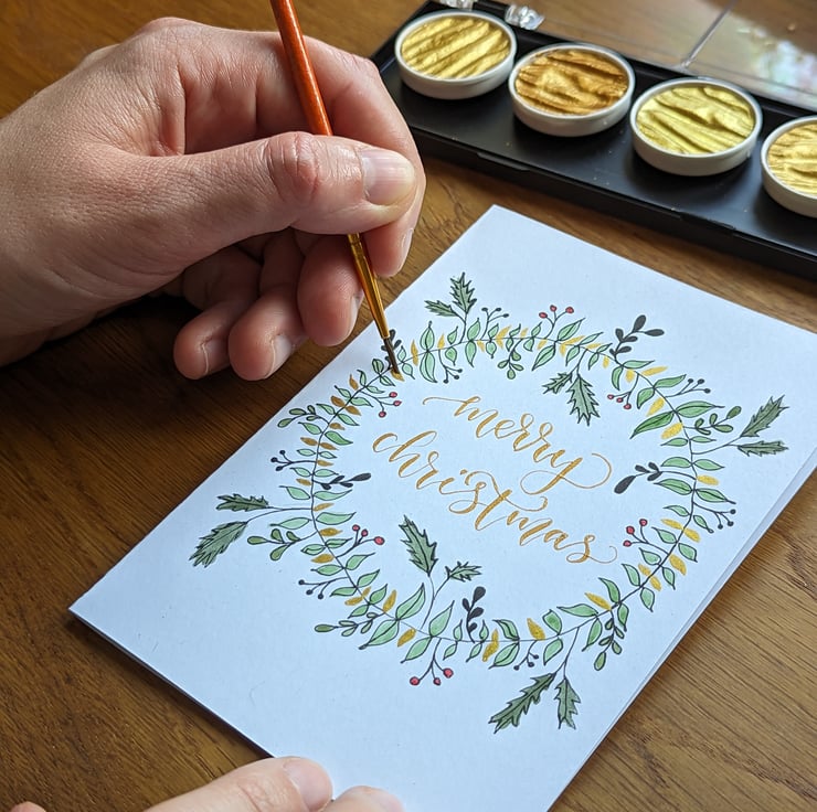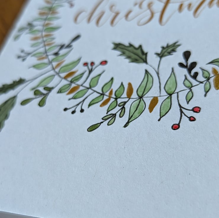 This beautiful Christmas card is perfect for sending your loved ones warm wishes this holiday season. The card features a hand-painted watercolour wreath with festive red, green and gold leaves and berries. The sentiment "Merry Christmas" is written in elegant calligraphy.