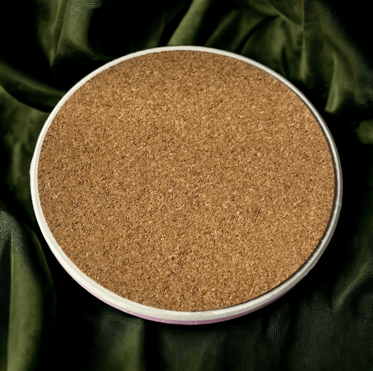 Each coaster measures approx 10cm in diameter and has been finished with a thin layer of cork on the reverse.