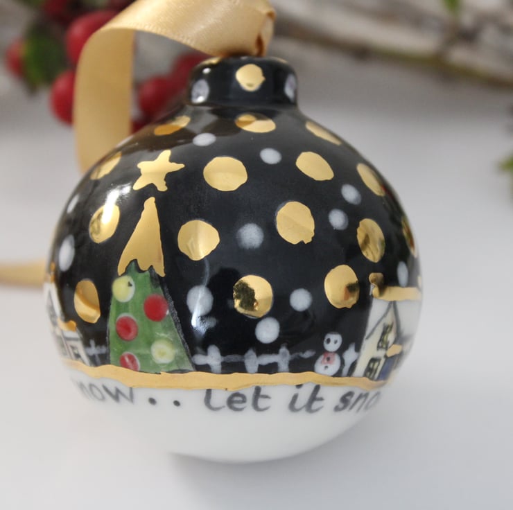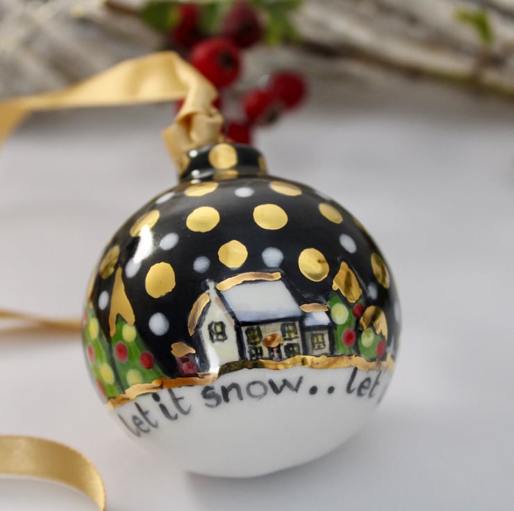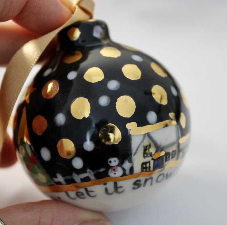 I hand paint with glaze a sparkly night sky above a snowy village with a quote of “let it snow” running around the bottom. I then fire before adding the magic sparkle of gold lustre and firing for a second time.
