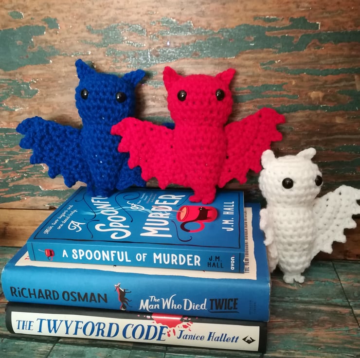 This set includes three mystery books and three bats. The bats are red, white and blue. They look great displayed on a bookshelf.