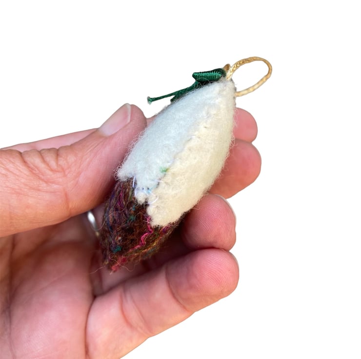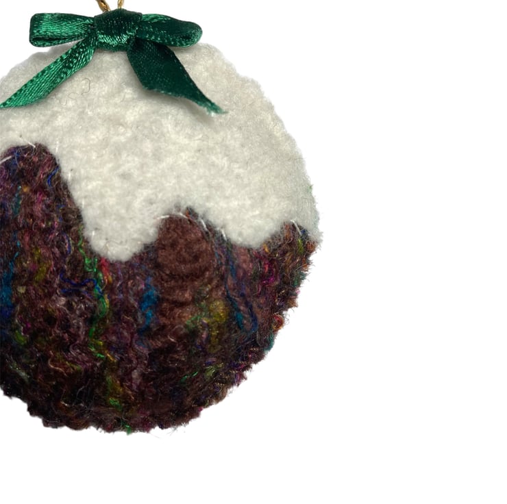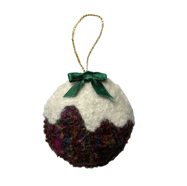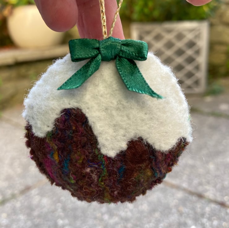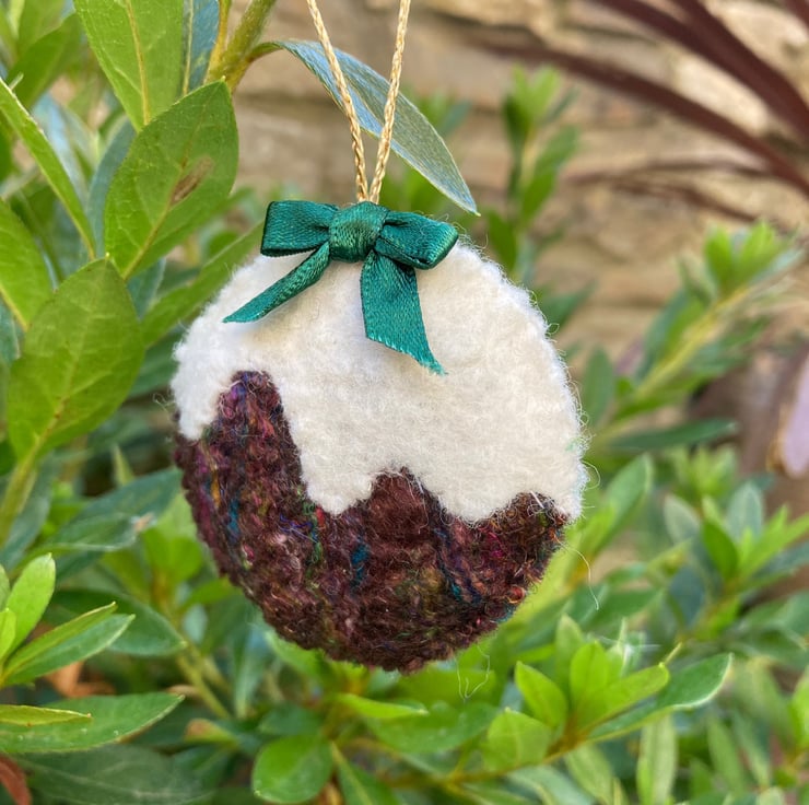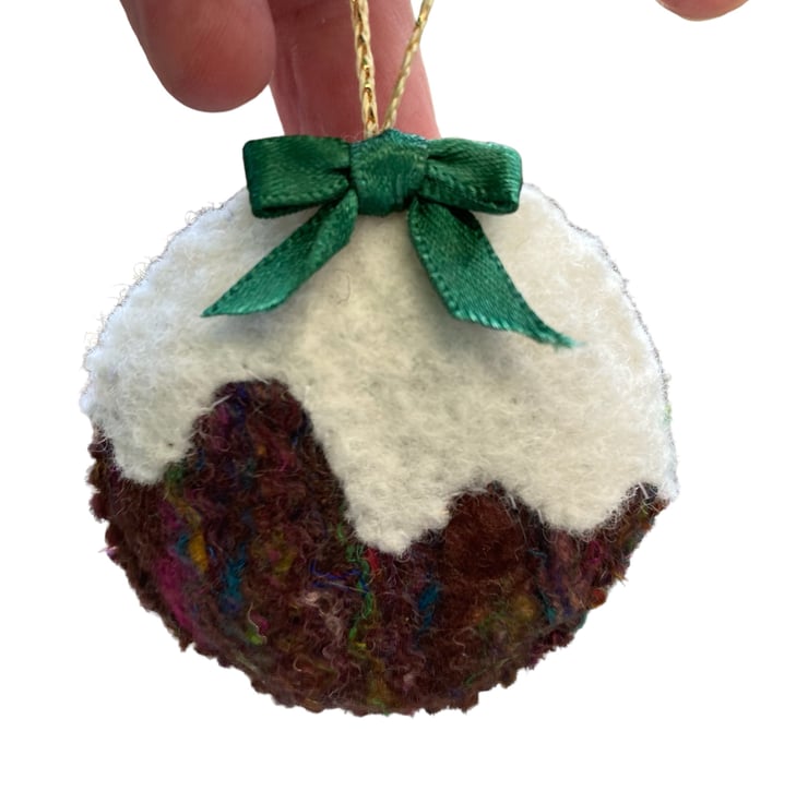 A cute little Christmas pudding to hang from your tree. The Christmas pudding has been made using two pieces of hand made felt. The pudding uses felt created using merino wool fibres topped with coloured silk fibres with the 'cream' being made from plain white merino wool fibres. The resulting felt pieces have been cut to size, hand stitched together and lightly stuffed with a polyester stuffing material. A golden coloured hanging thread has been attached and a small green bow added to the top of the pudding.