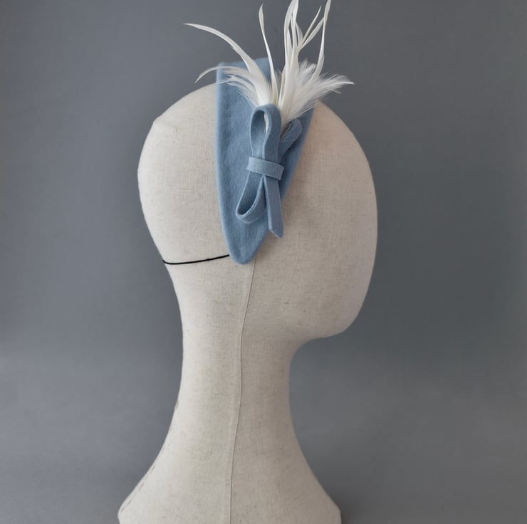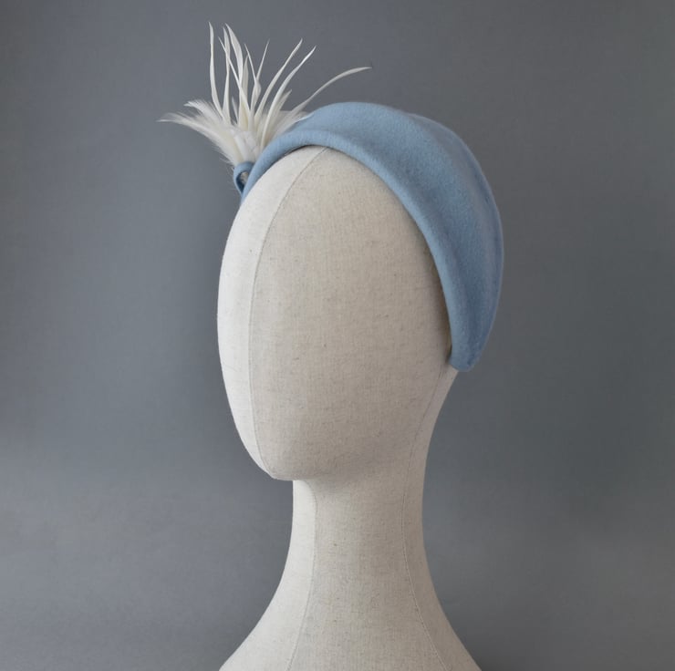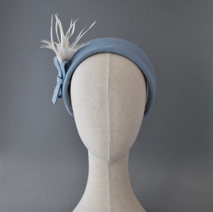 An on trend light sky blue wool felt, and trimmed with a matching bow and a spray of cream goose feathers. Like all my headwear, this headpiece handcrafted in my Kent millinery studio, being blocked and sewn by hand, and wired to ensure it keeps its structure when worn.