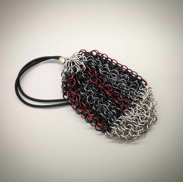 Made from stainless steel and anodised aluminium rings finished off with stretchy cord and steel push toggle closure