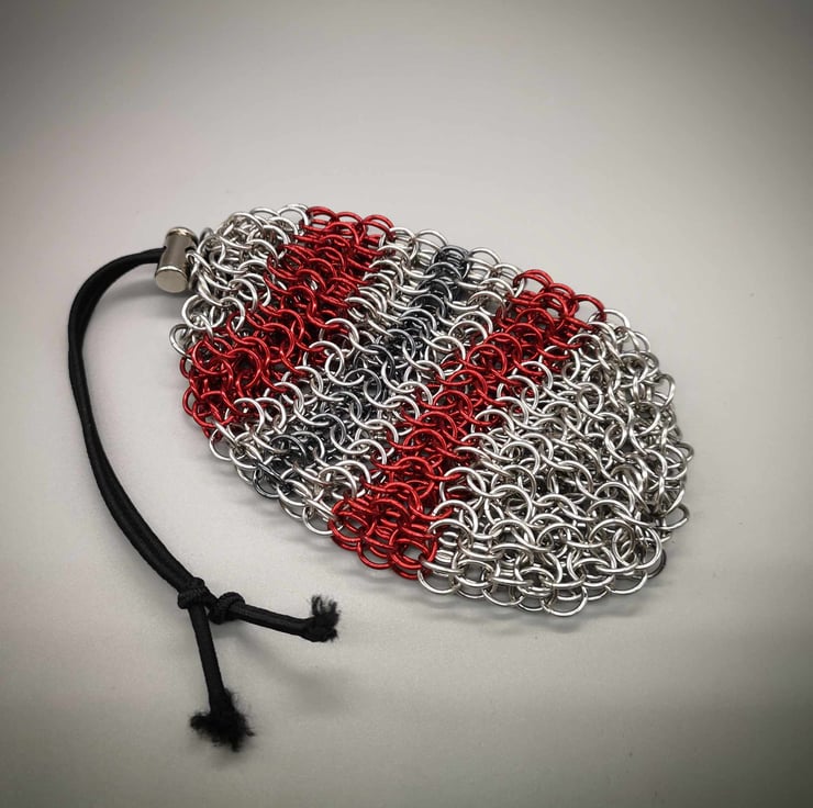Available in 2 designs, main body of the bags comprised of alternating coloured rings with a solid silver bases, comfortably holds 30 D6 dice each, perfect for RPG dice sets (dice not included)