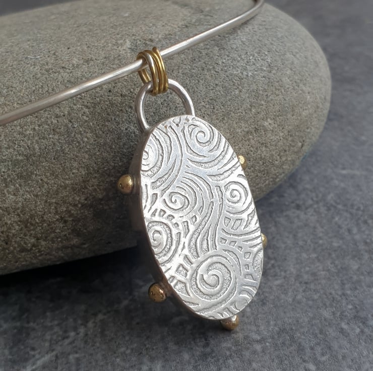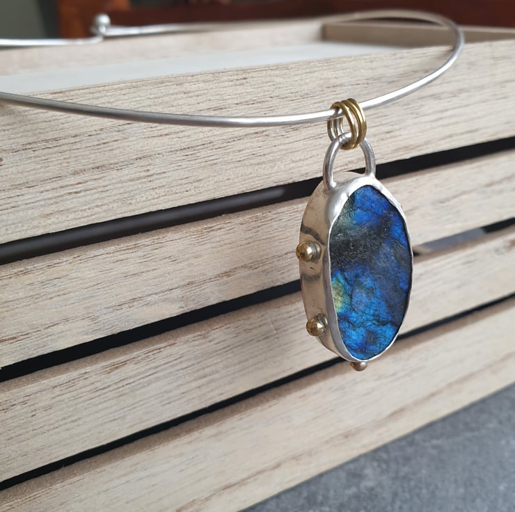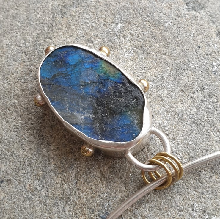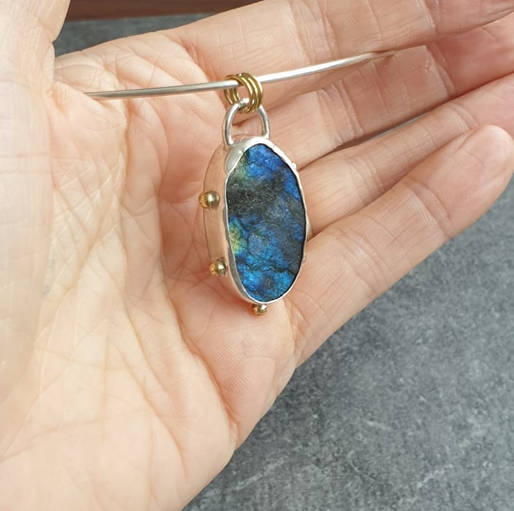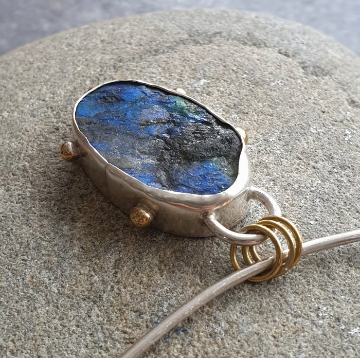 This simply stunning labradorite statement necklace has been handmade using traditional silversmithing techniques. It features an irregular oval shaped piece of rough cut labradorite which I've set in a sterling silver bezel, The back of the bezel has been embossed with a swirly spiral design - making the pendant reversible - and I've added a series of tiny brass balls to the outer edge of the bezel to add extra detail and echo the flashes of colour in the gemstone.