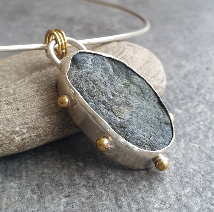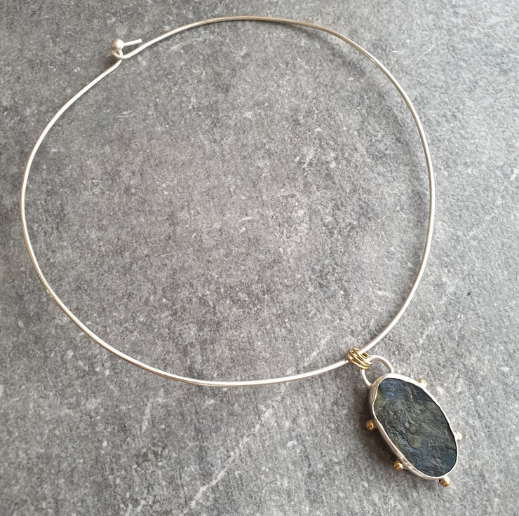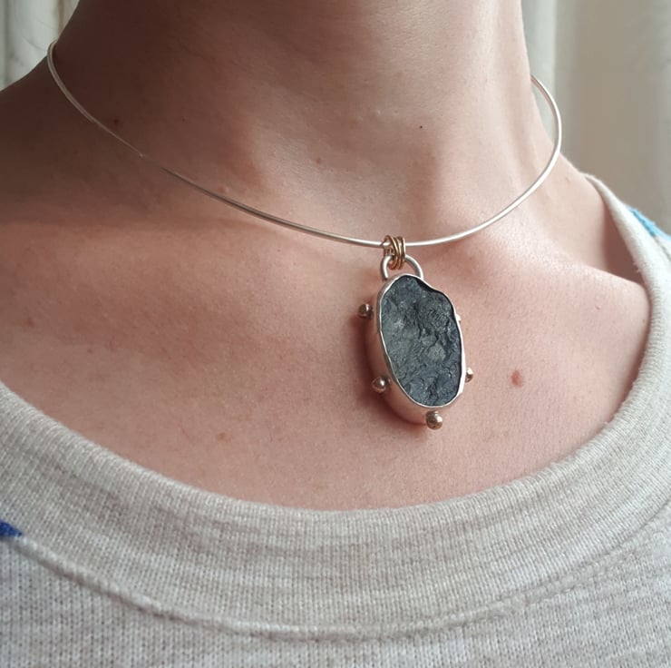 The pendant hangs from a handmade wire choker, using brass rings to tie in the colour which gives it a very contemporary look. The torque choker fastens with a hook and ball catch, so if you prefer you can easily remove the pendant and hang it from your own choice of other chain or cord for a different look.