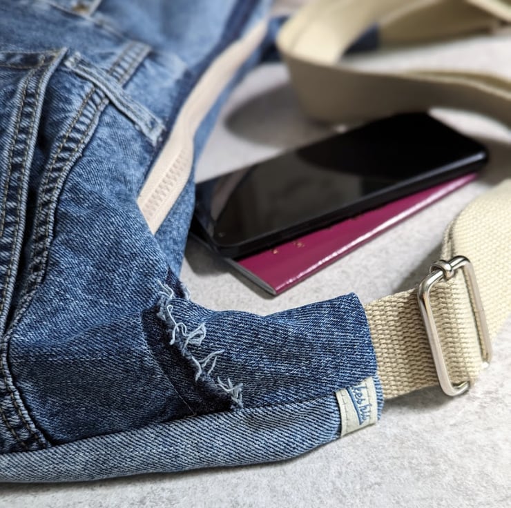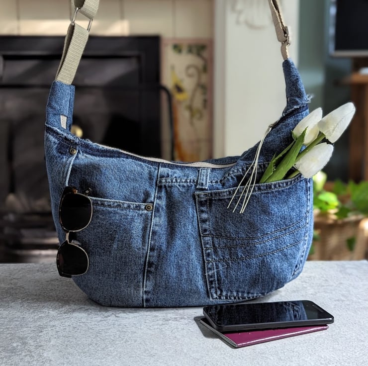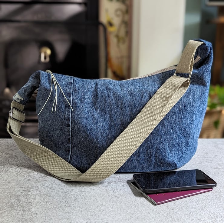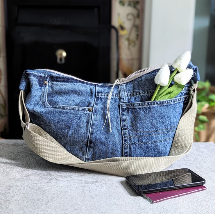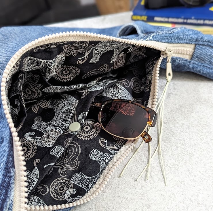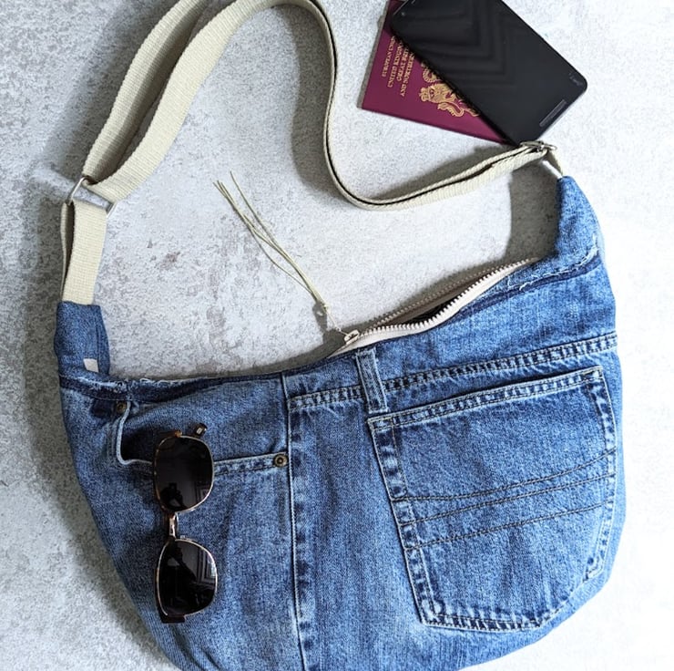 Preloved and upcylcled denim jeans, with an elephant print lining (see photo), this this cross body dumpling bag has a stylish and casual feel.