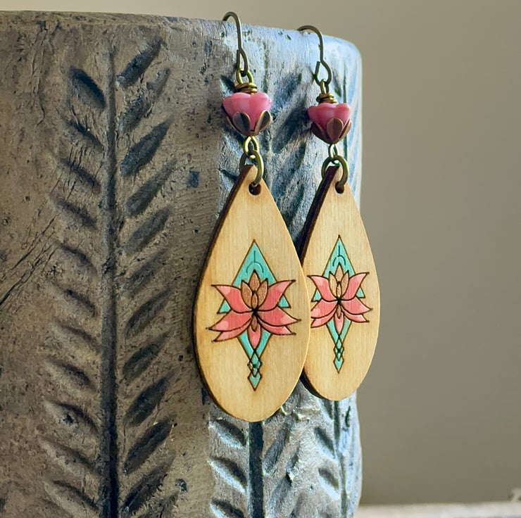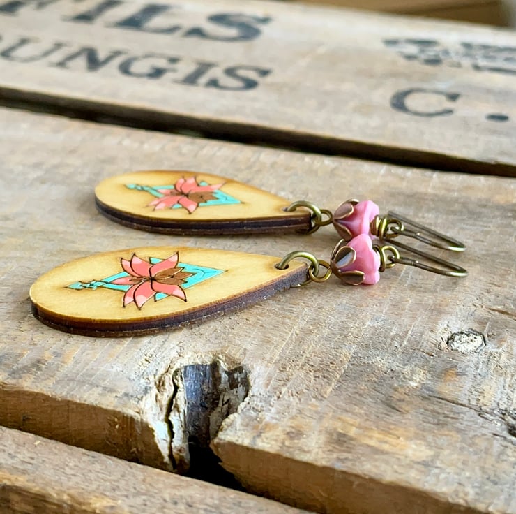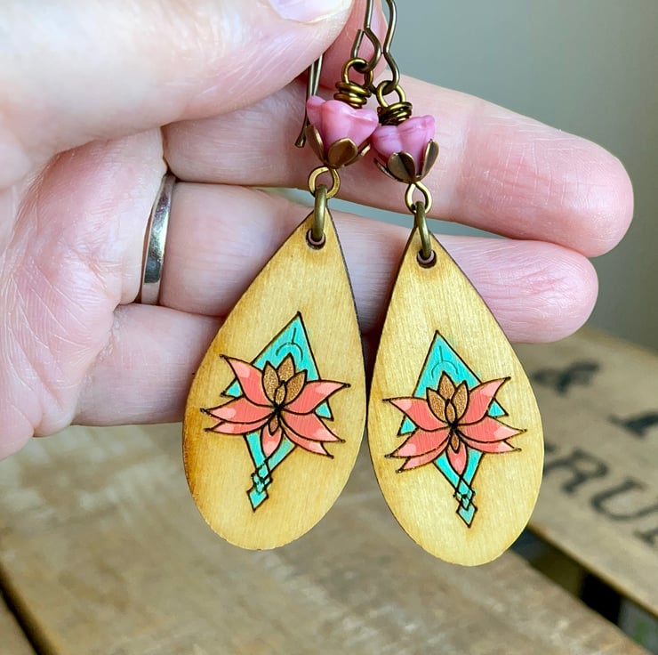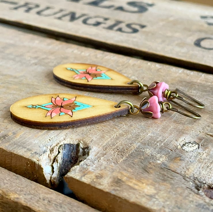 They feature rustic Baltic Birch wood charms, with a hand-painted floral design in vibrant shades of turquoise and coral-pink.