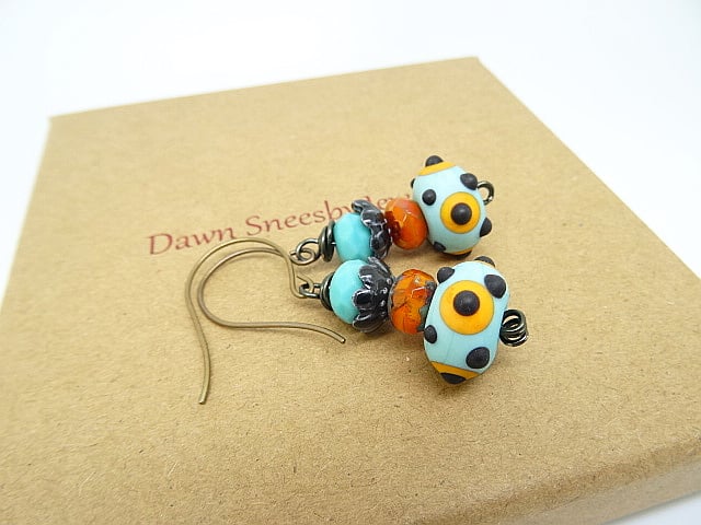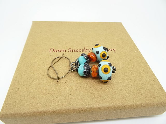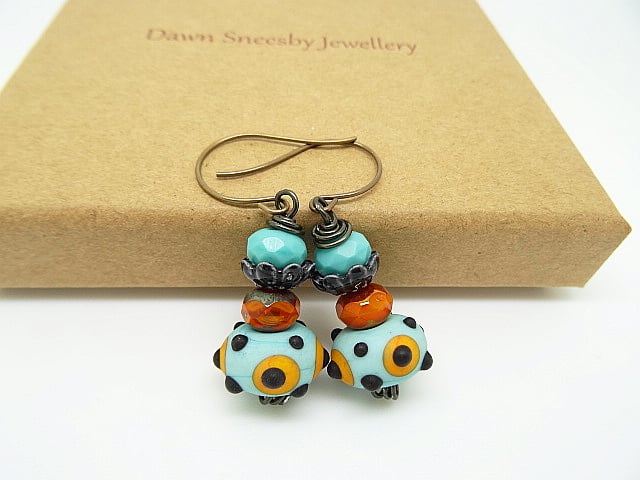 These earrings are just lovely and very eye catching. I have made them using handmade lampwork glass beads in gorgeous vivid shades of turquoise and orange with black bumpies running around the centre - they have a matt finish and measure 15mm x 10mm. To these I have wired 9 x 6mm Czech glass faceted rondel beads in burnt orange and turquoise which are capped with lovely ceramic intricate patterned bead caps in black. The earrings measure 2 inches (5cm) from top of vintaj brass, nickel free, round loop ear wires.