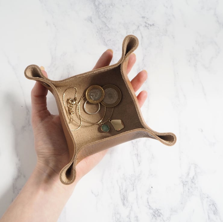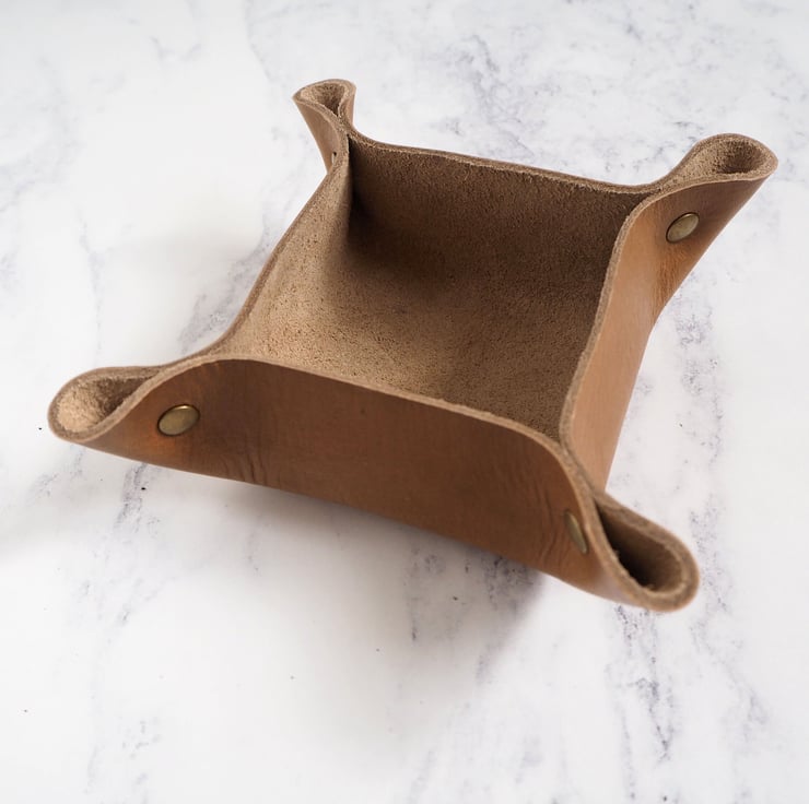 The leather valet coin tray - With antique brass coloured rivets and it's raw cut edges this tray is completely handmade.