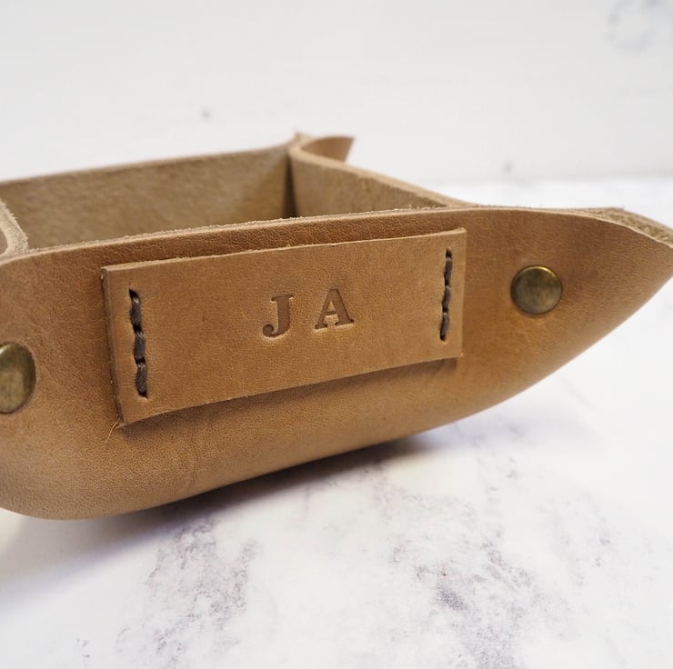 A unique and useful gift ideal for the men or that difficult to buy for person! Perfect for a 3rd Wedding Anniversary gift. Personalise your tray with up to 3 letters - this will be stamped on a small tag of leather which is then stitched to the side of the tray.