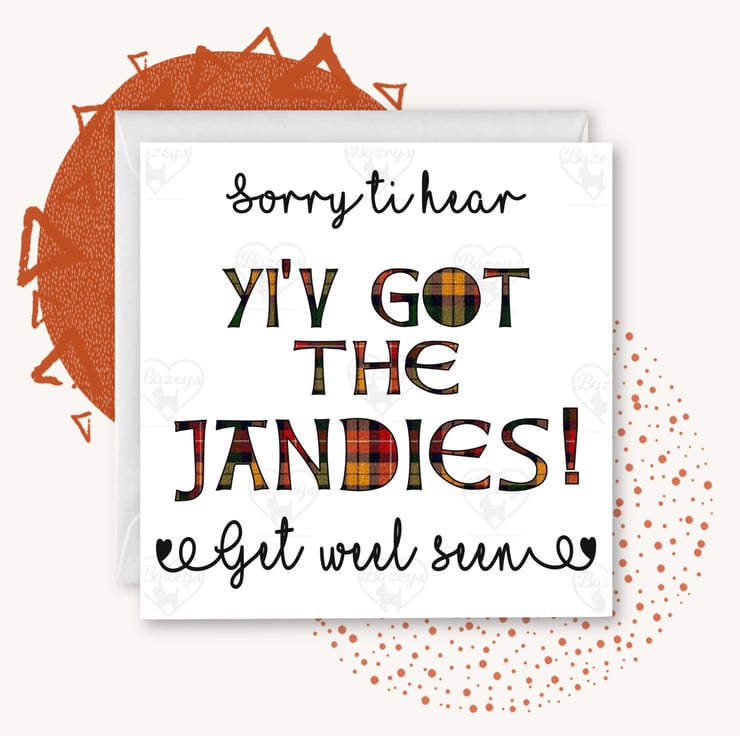 Cheer up someone who’s feeling poorly with this card that always makes folk laugh when I’m at markets and fairs! For the uninitiated, the “jandies” is pretty much any illness that makes you feel rubbish (though it was originally the term given to jaundice in days gone by). I hadn’t used or heard it for ages… then along came Covid! If yi canna ca’ the covid “the Jandies” then I’ve nae idea fit else yi’d ca’ it!