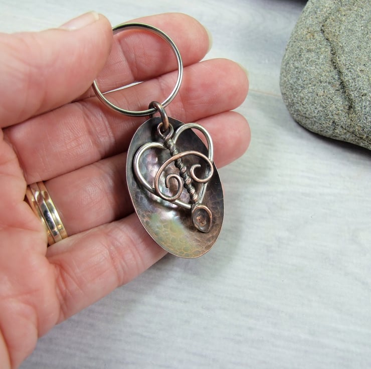 Bag Charm Welsh Love Spoon. Sterling Silver and Copper Keyring. 7th Wedding Anniversary Gift. Can also be worn as a pendant necklace.