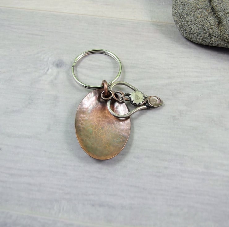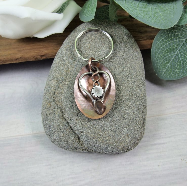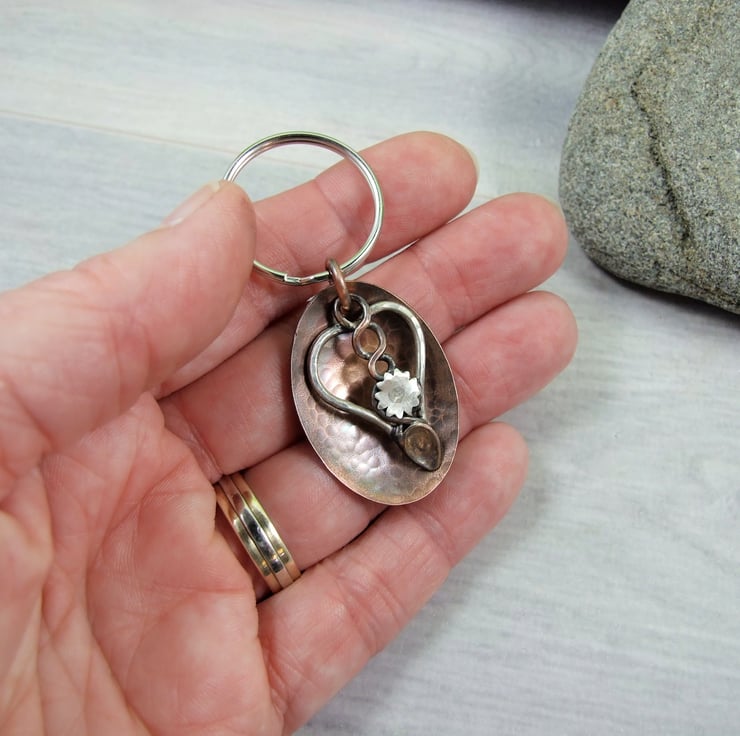 Welsh Love Spoon Keyring. Sterling Silver and Copper Bag Charm. 7th Wedding Anniversary Gift. Can also be worn as a pendant necklace.