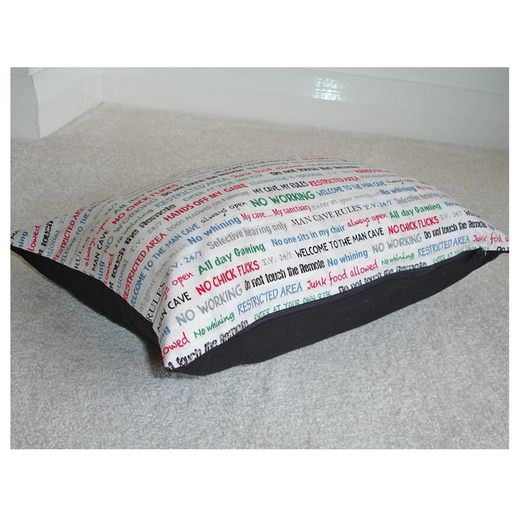The back of the cushion cover is in a plain black cotton fabric with a zip at the base for easy insertion and removal of the cushion pad.
