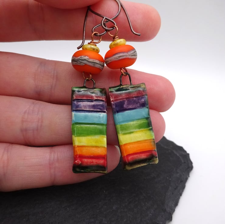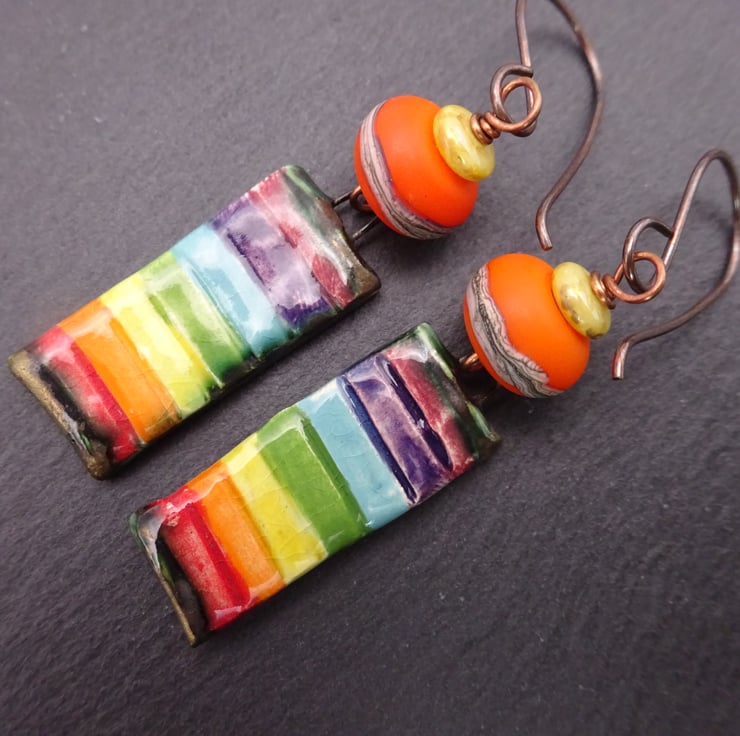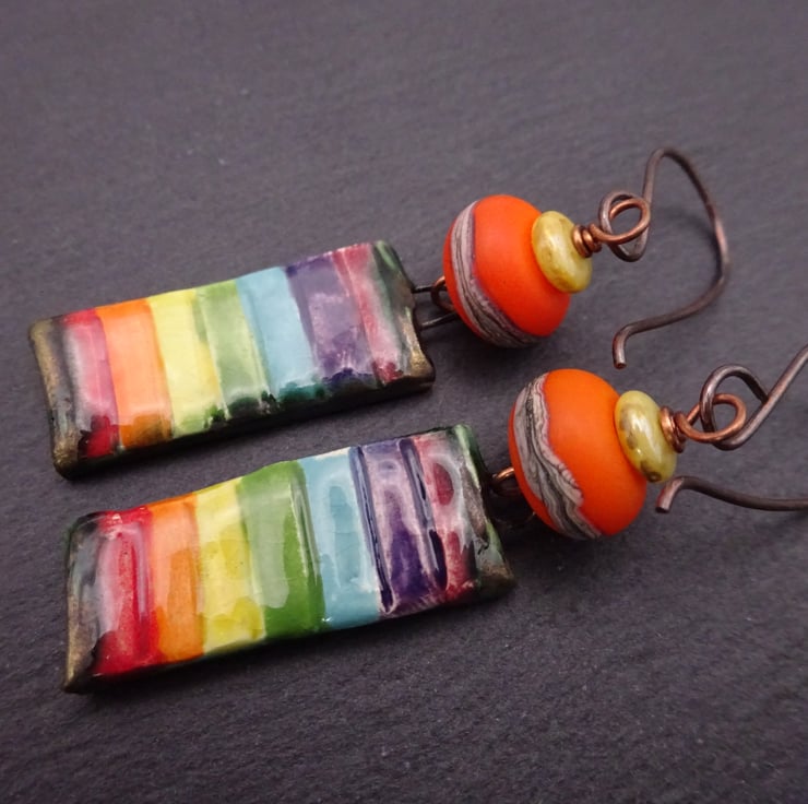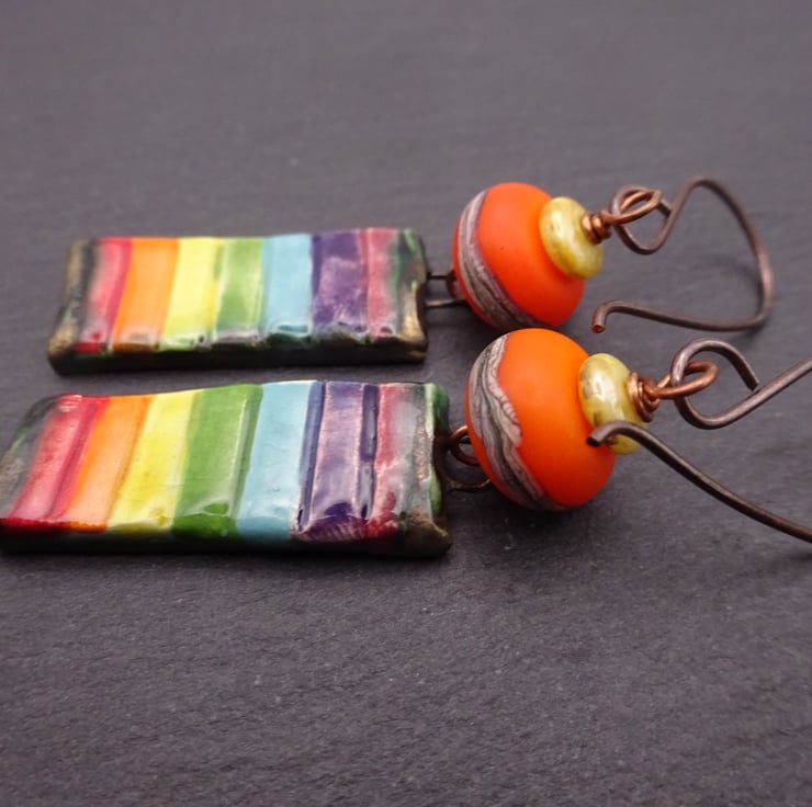 A pair of earrings made with handmade copper ear wires, handmade lampwork glass beads and handmade ceramic drops.