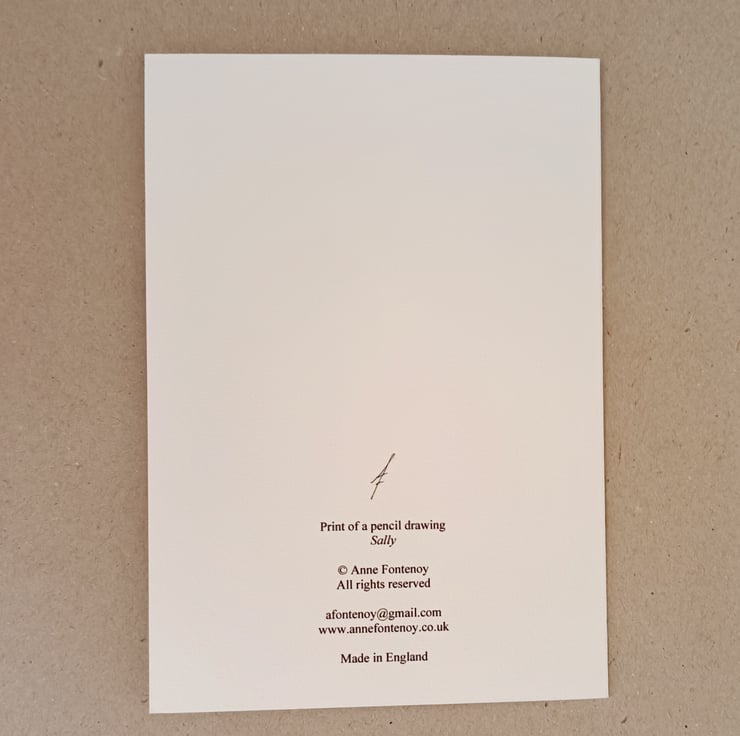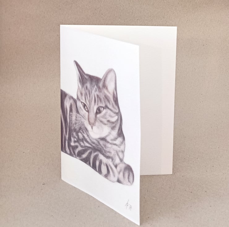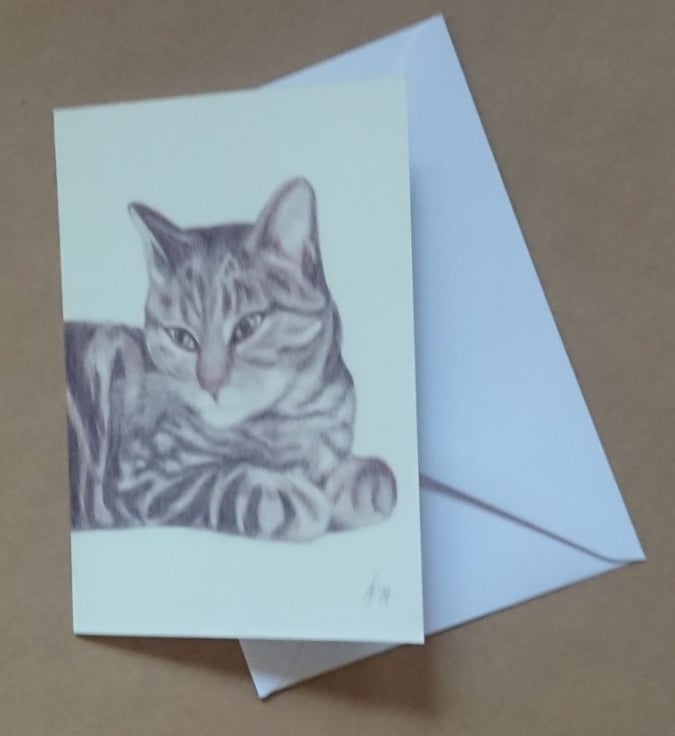 This tabby cat card is handmade. I print it from a scan of one of my original A4 pencil drawings. Sally was a cat I had for a while when I lived in North London.