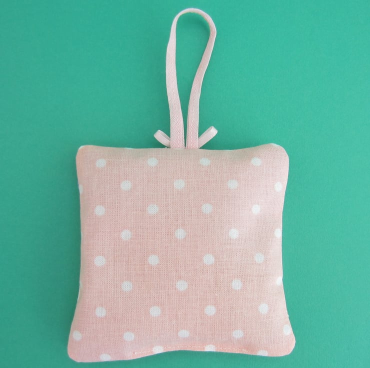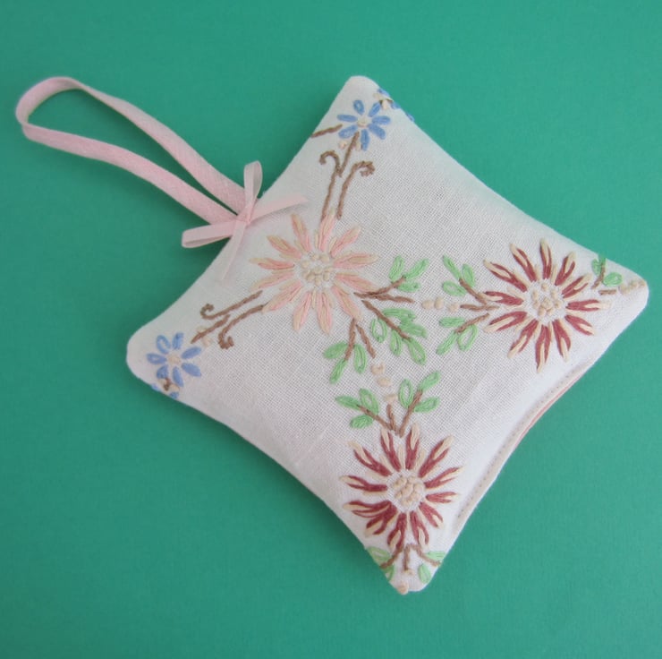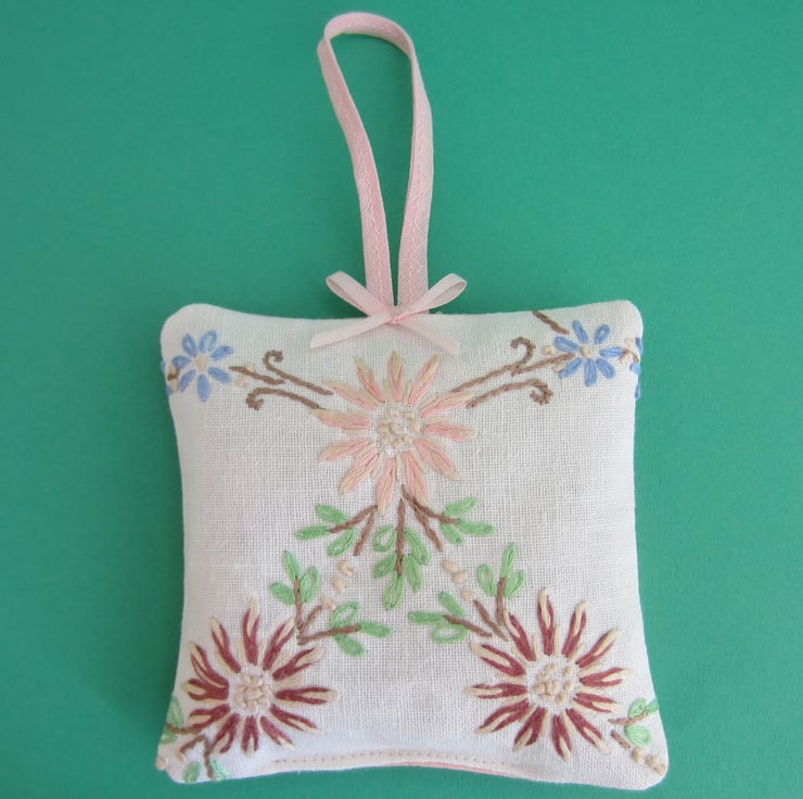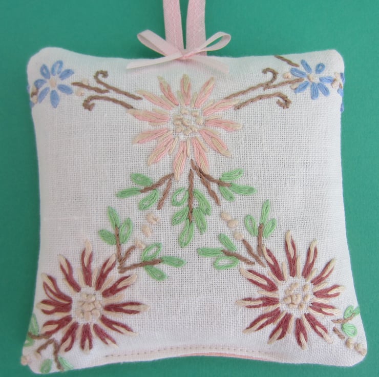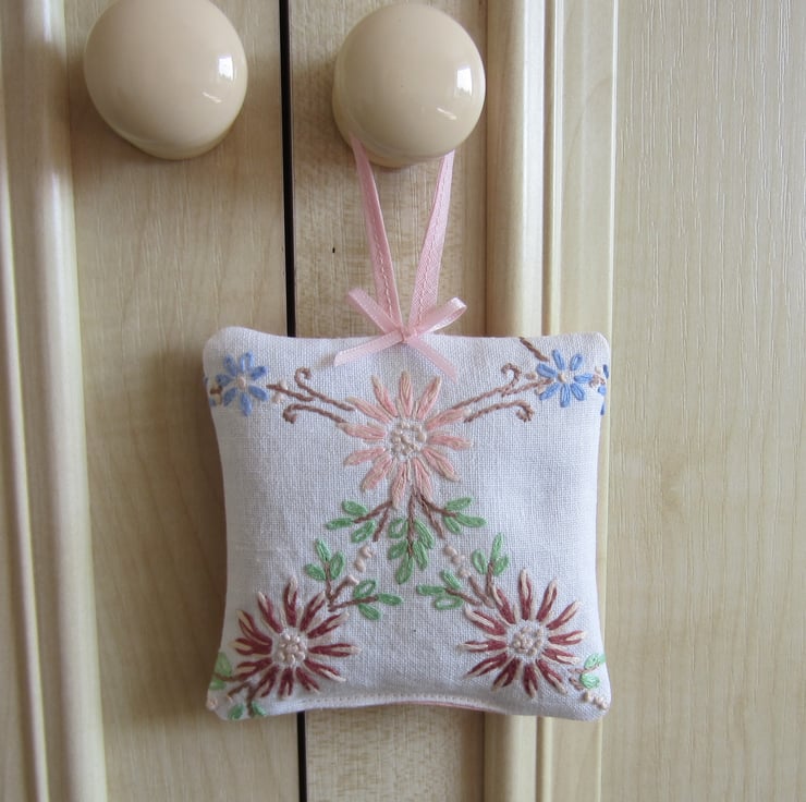 Hanging lavender sachet with a vintage embroidered flower and leaf design front in pink, blue, brown and green colours with an added pink ribbon bow. The back is in a coordinating pink and white spotty fabric.