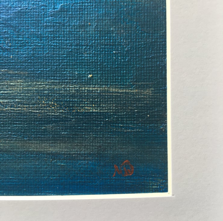 The background is metallic blue overlaid with iridescent paint which gives the painting a subtle shift in colour as you move position around it (as highlighted in the photos). This makes it even more of a delight in real life than photos can do justice to!