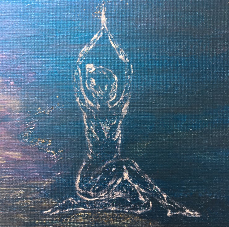 I decided to experiment with a lack of solidness to the lines of the yogi as a way of expressing this energy. Using light reflecting paints and glitters helped to create the ethereal feel.