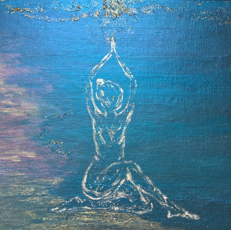 The third painting in sold-out yoga series. "Prayer Twist" is a graceful seated meditation pose in mid/dark blue, highlighted with iridescent golden and pink flashes and finished with sparkling golden energy from the glittery sky.