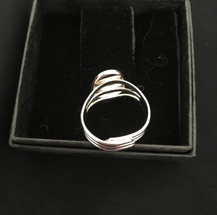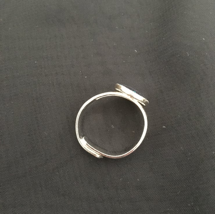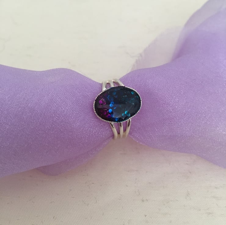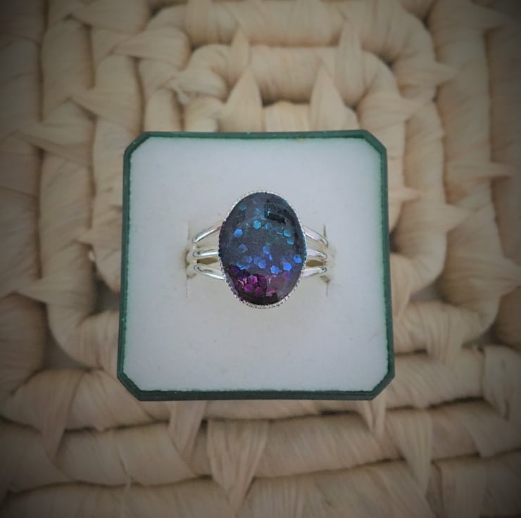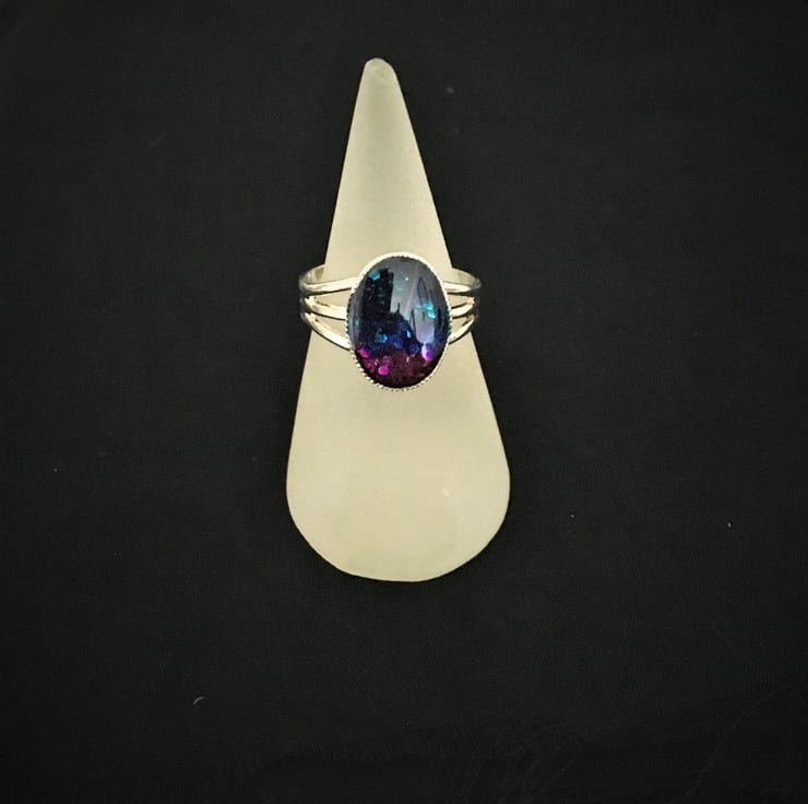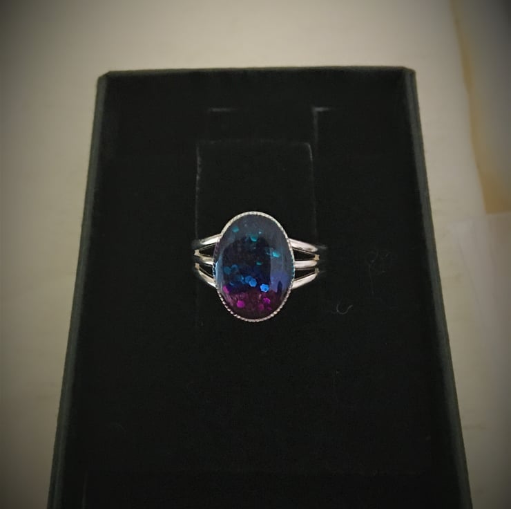 Very pretty striking ring using a tri-colour base with a 2 part resin mix overlay, the colours gently catch the light as the ring moves when worn.